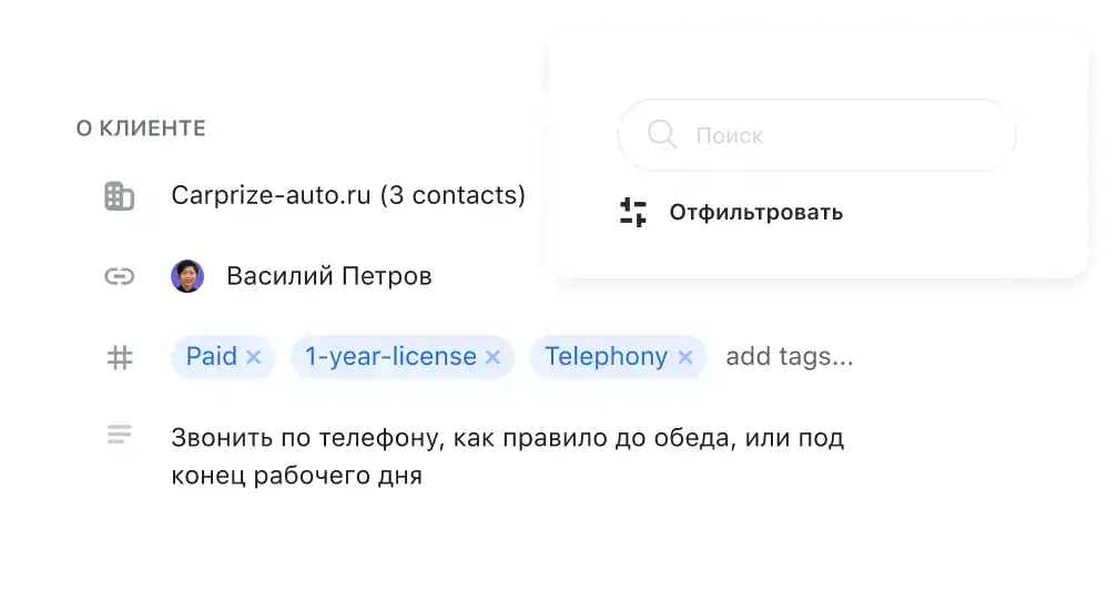 Ищите сообщения по ключевым словам, ставьте теги, добавляйте напоминания и всегда будьте в курсе, на каком этапе находится сделка.