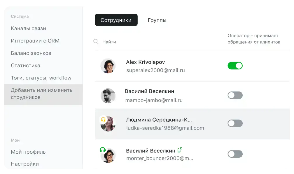 Добавляйте операторов и назначайте разные права в зависимости от задач сотрудника.