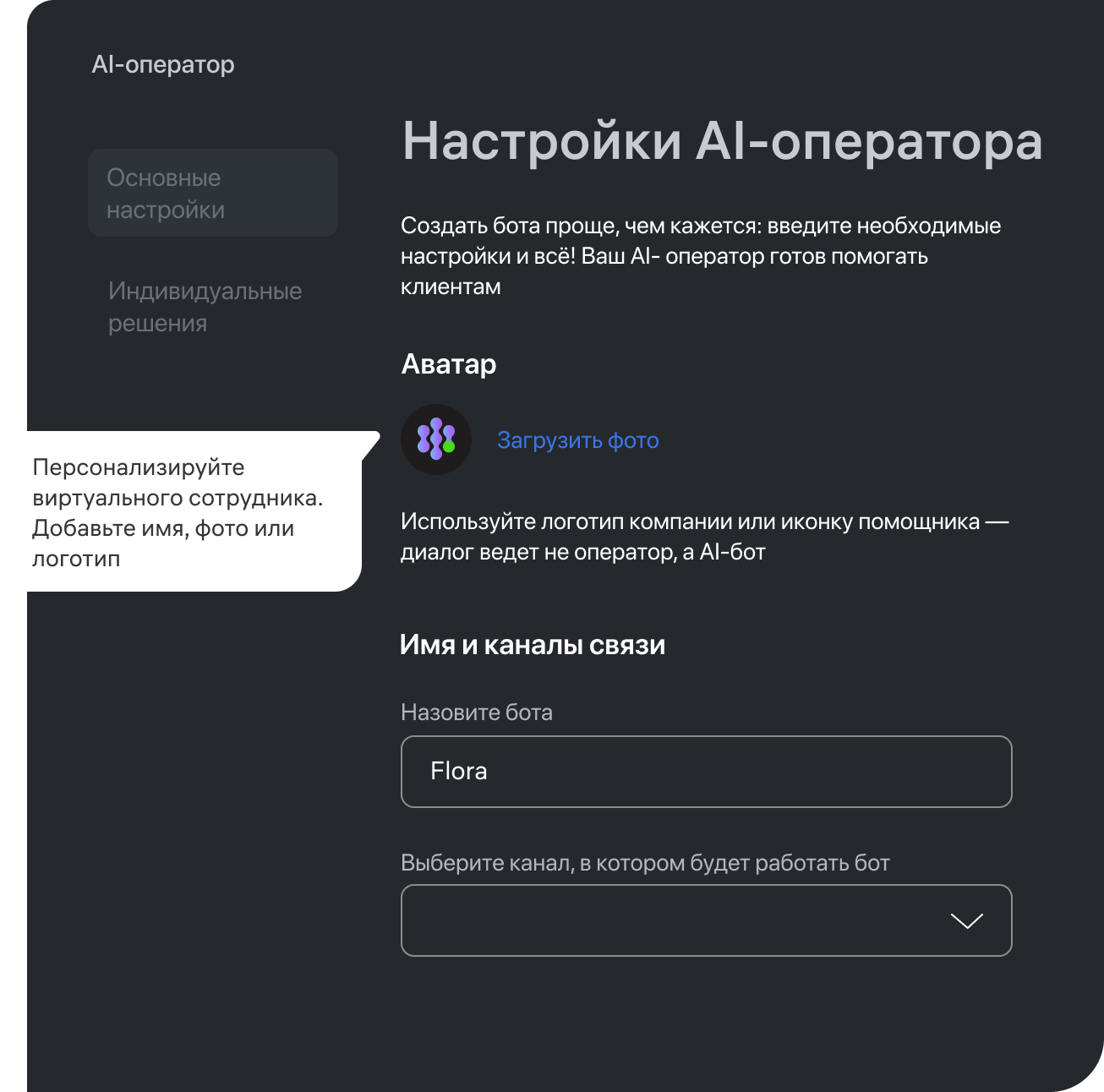 - Выбрать каналы связи для AI-агента: чат на сайте, мессенджеры, соцсети.