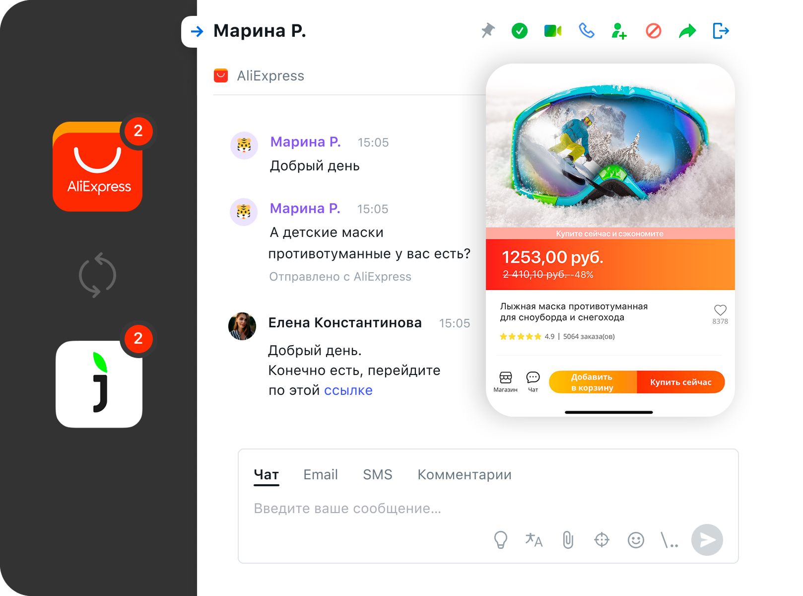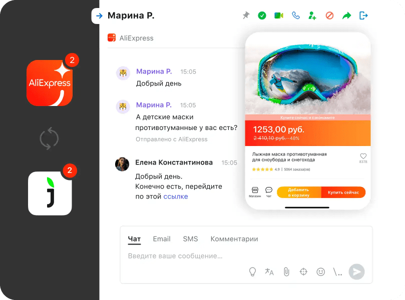 Благодаря интеграции Jivo & AliExpress вы можете выйти на новую аудиторию и улучшить клиентский опыт, отвечая на вопросы покупателей быстрее остальных продавцов.