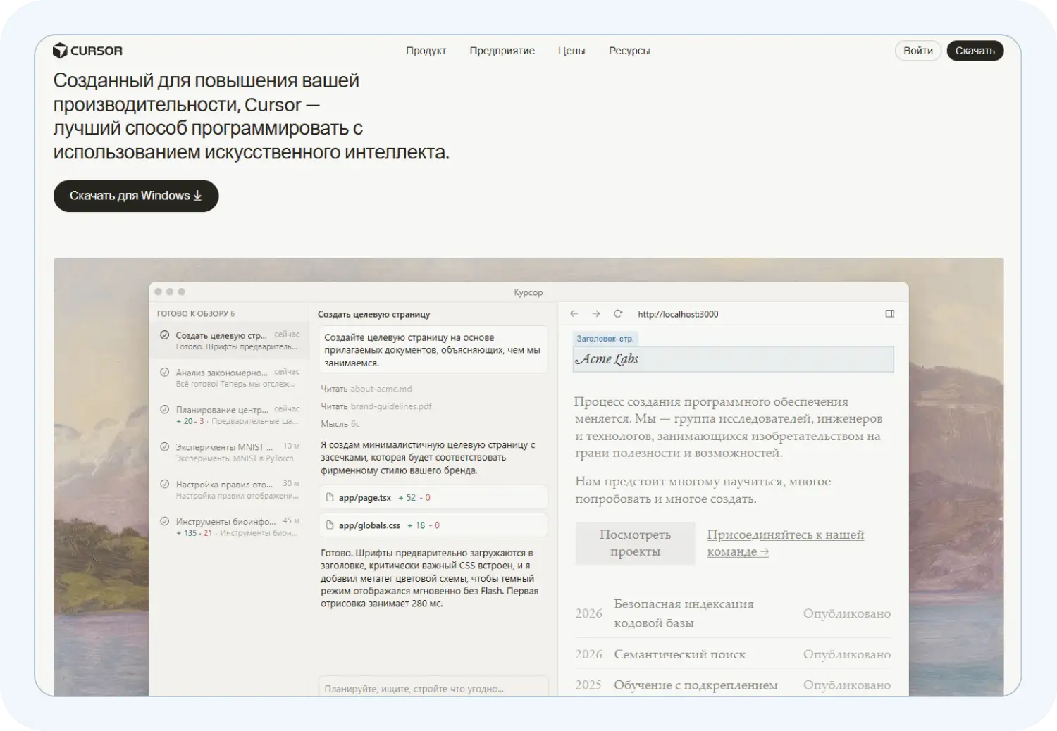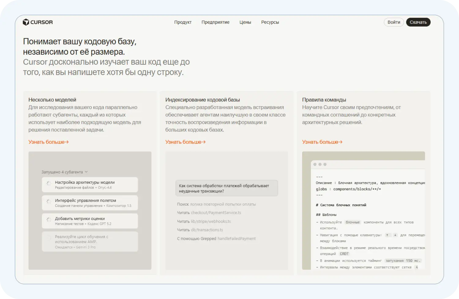 Многие путают Cursor с обычными расширениями вроде GitHub Copilot. Однако нейросеть Cursor — это самостоятельный редактор кода, созданный стартапом Anysphere.