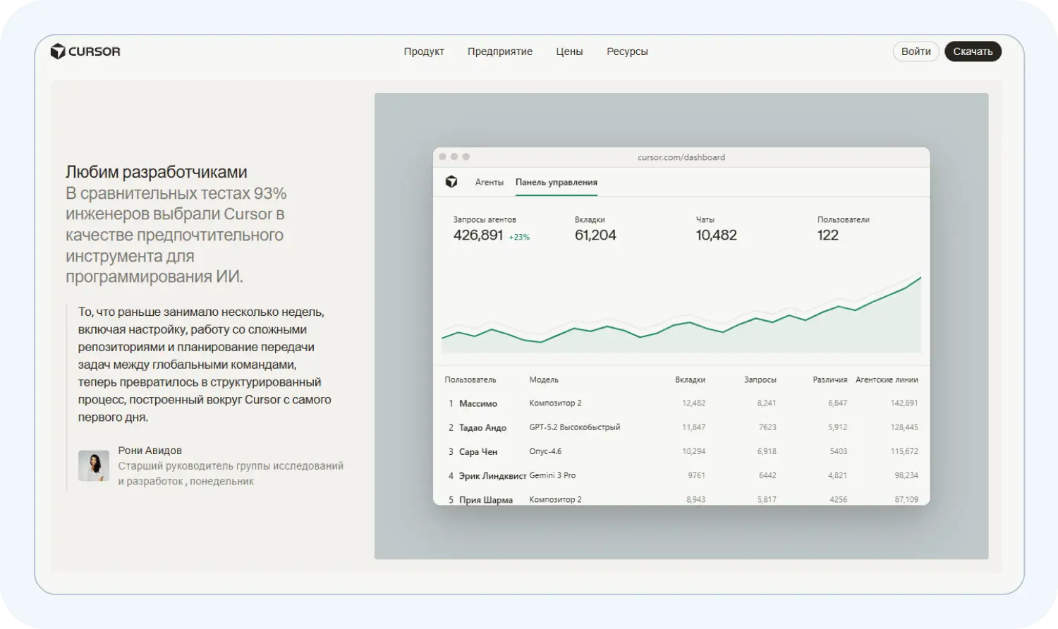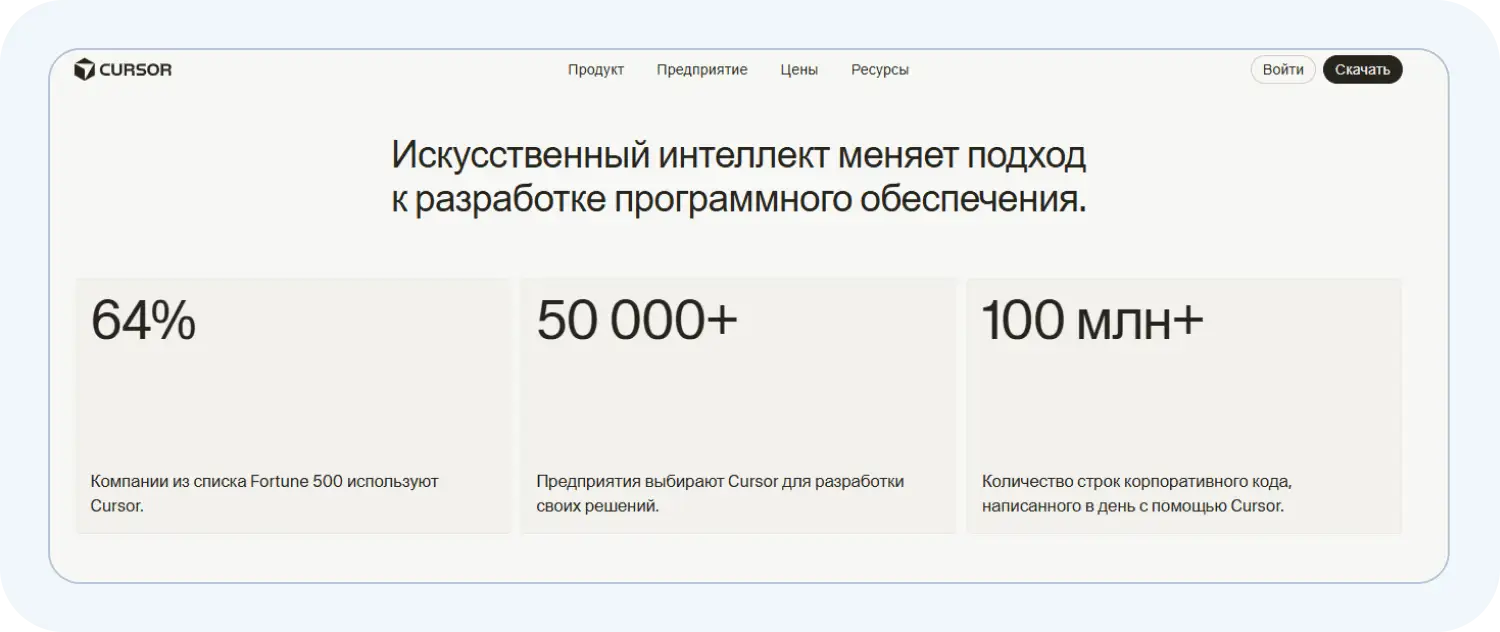 - Снижение порога входа: Джуниор-разработчики с помощью Cursor начинают выдавать код уровня мидлов, так как ИИ выступает в роли «синьора» рядом, который проверяет ошибки и подсказывает лучшие практики.