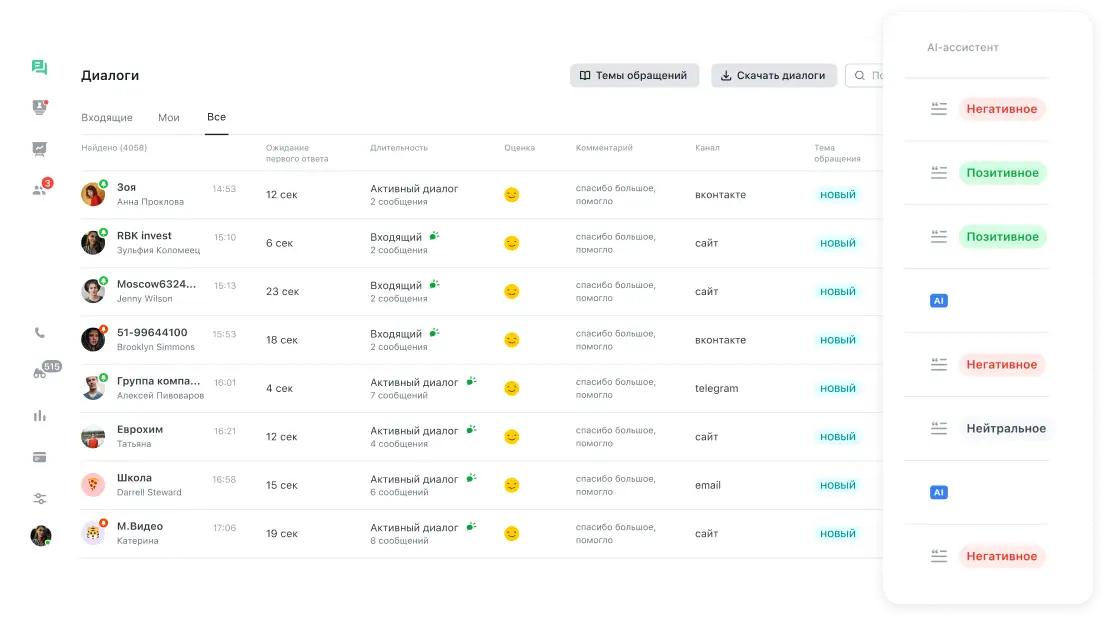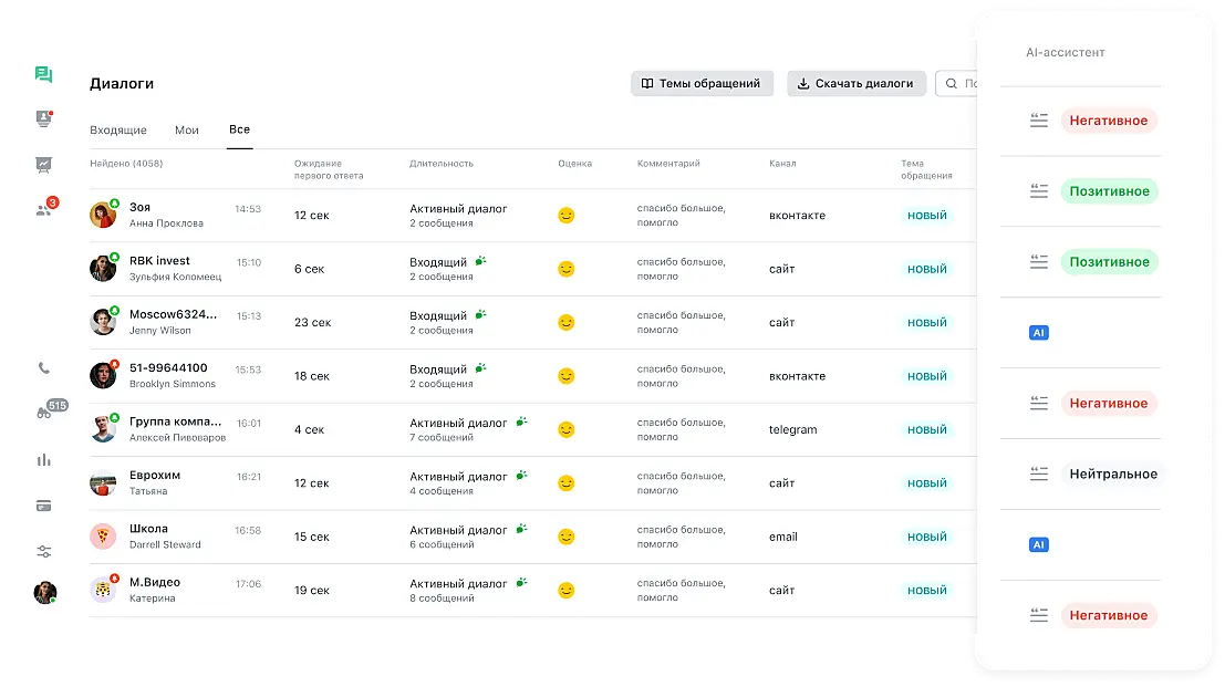 - выявить проблемные диалоги, вовремя исправить ситуацию и сохранить лояльность клиента;