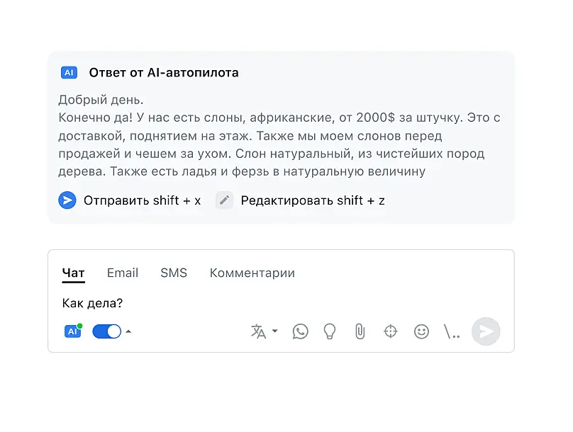 Пока оператор занят другими диалогами или просто отлучился, ИИ-автопилот сгенерирует ответ в текущем чате с учетом контекста и заданных настроек. Человеку останется проверить детали и отправить готовое сообщение клиенту. Таким образом, опция позволяет вести несколько чатов параллельно, не теряя при этом в качестве ответов.