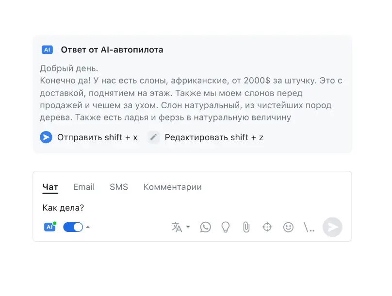 Пока оператор занят другими диалогами или просто отлучился, AI-автопилот сгенерирует ответ в текущем чате с учетом контекста и заданных настроек. Человеку останется проверить детали и отправить готовое сообщение клиенту. Таким образом, опция позволяет вести несколько чатов параллельно, не теряя при этом в качестве ответов.