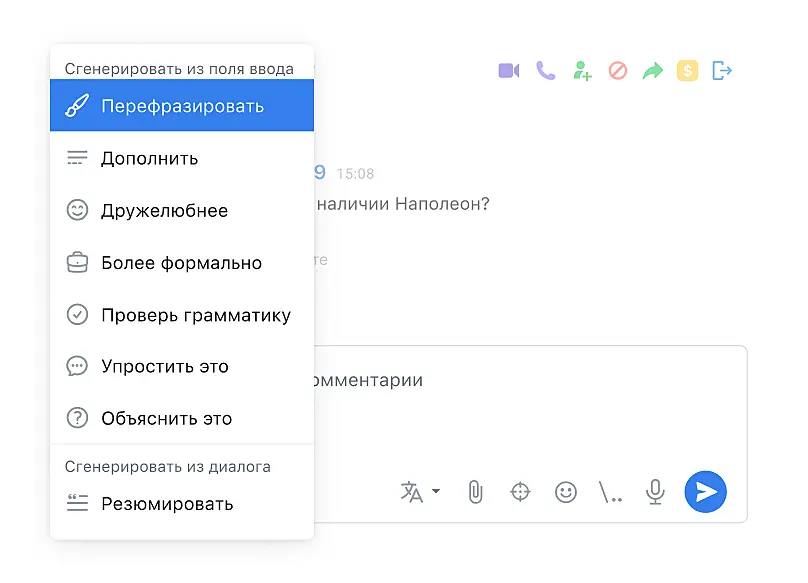 Прежде всего — освободит ресурсы операторов для более тщательной проработки клиентских запросов. Подбор подходящих слов в деловых переписках — рутинный процесс, который отнимает много времени и внимания. С ИИ-ассистентом консультанту достаточно ввести суть сообщения, а искусственный интеллект преобразует текст в необходимый вид.