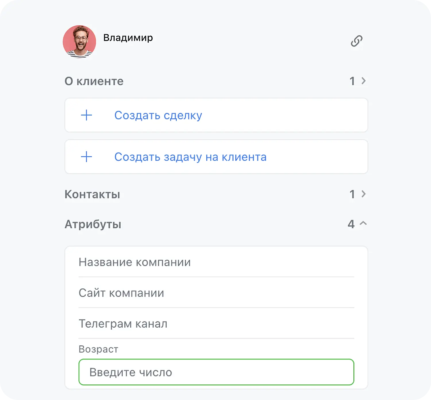 Теперь поле с атрибутом появится в форме контактов и при заполнении данные будут сохраняться в карточке клиента: