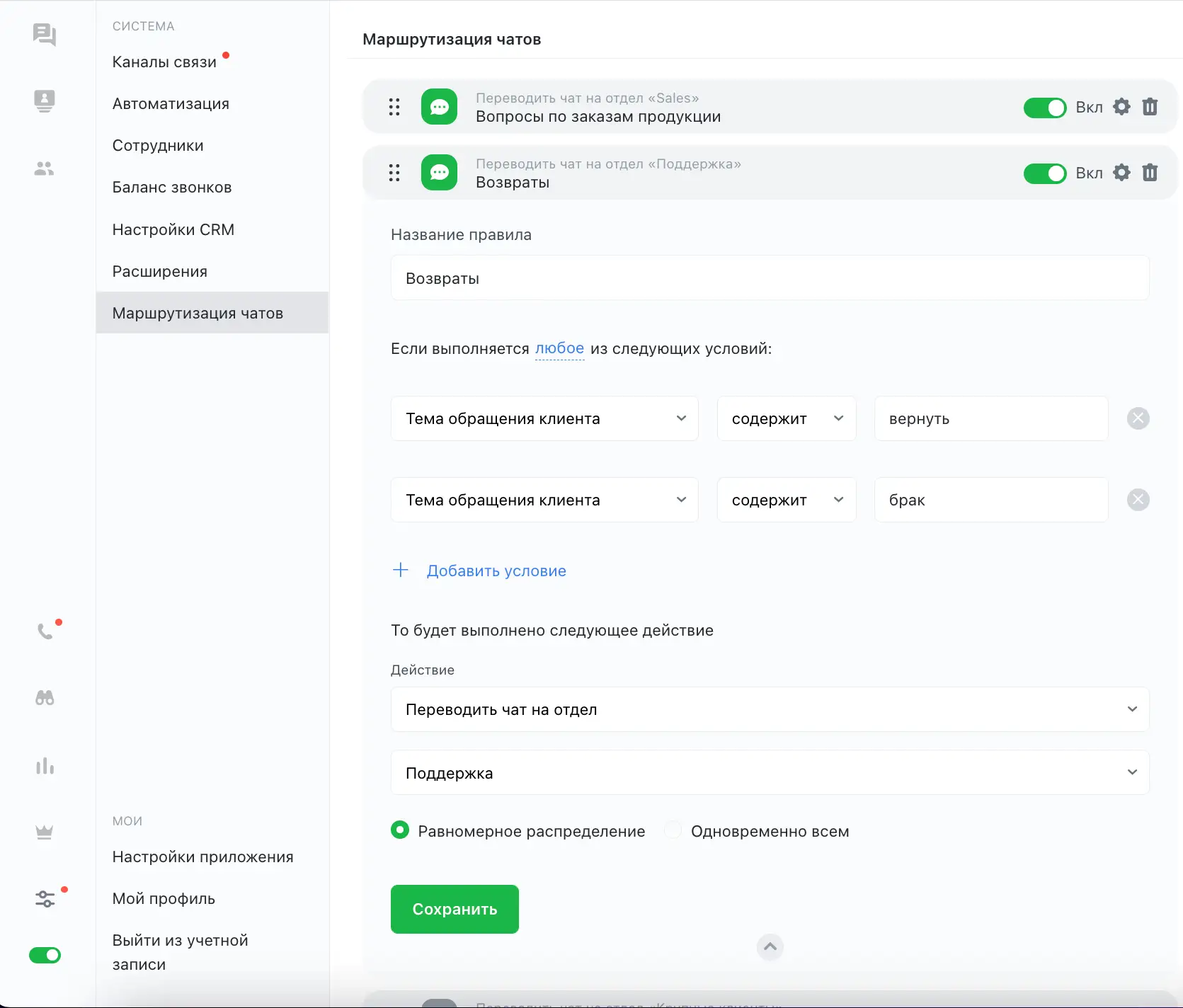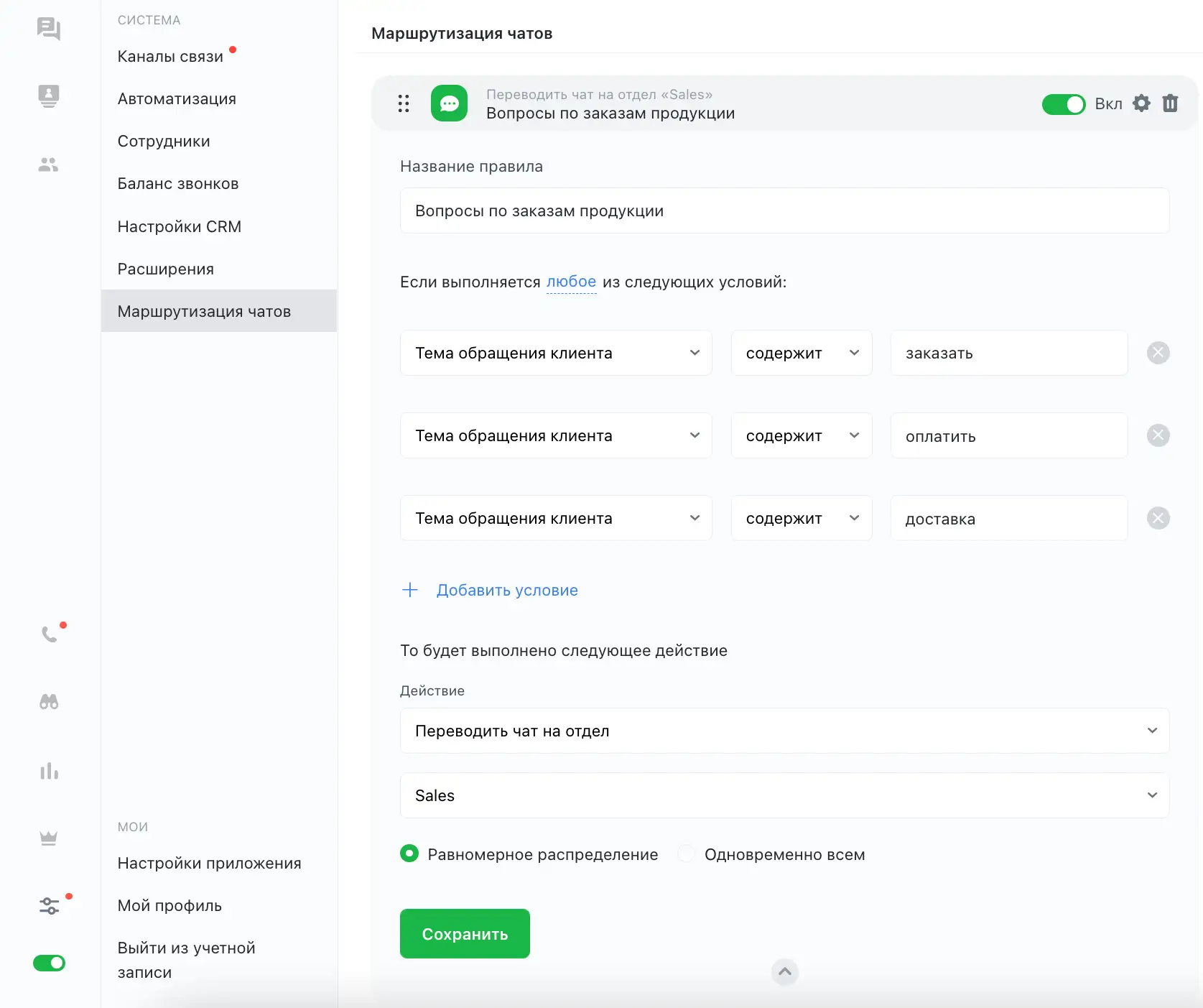 - распределять диалоги по любым заданным условиям (тема обращения, канал связи, время суток и т.п.) — чтобы клиент получил необходимую информацию в соответствующем отделе в максимально короткие сроки.