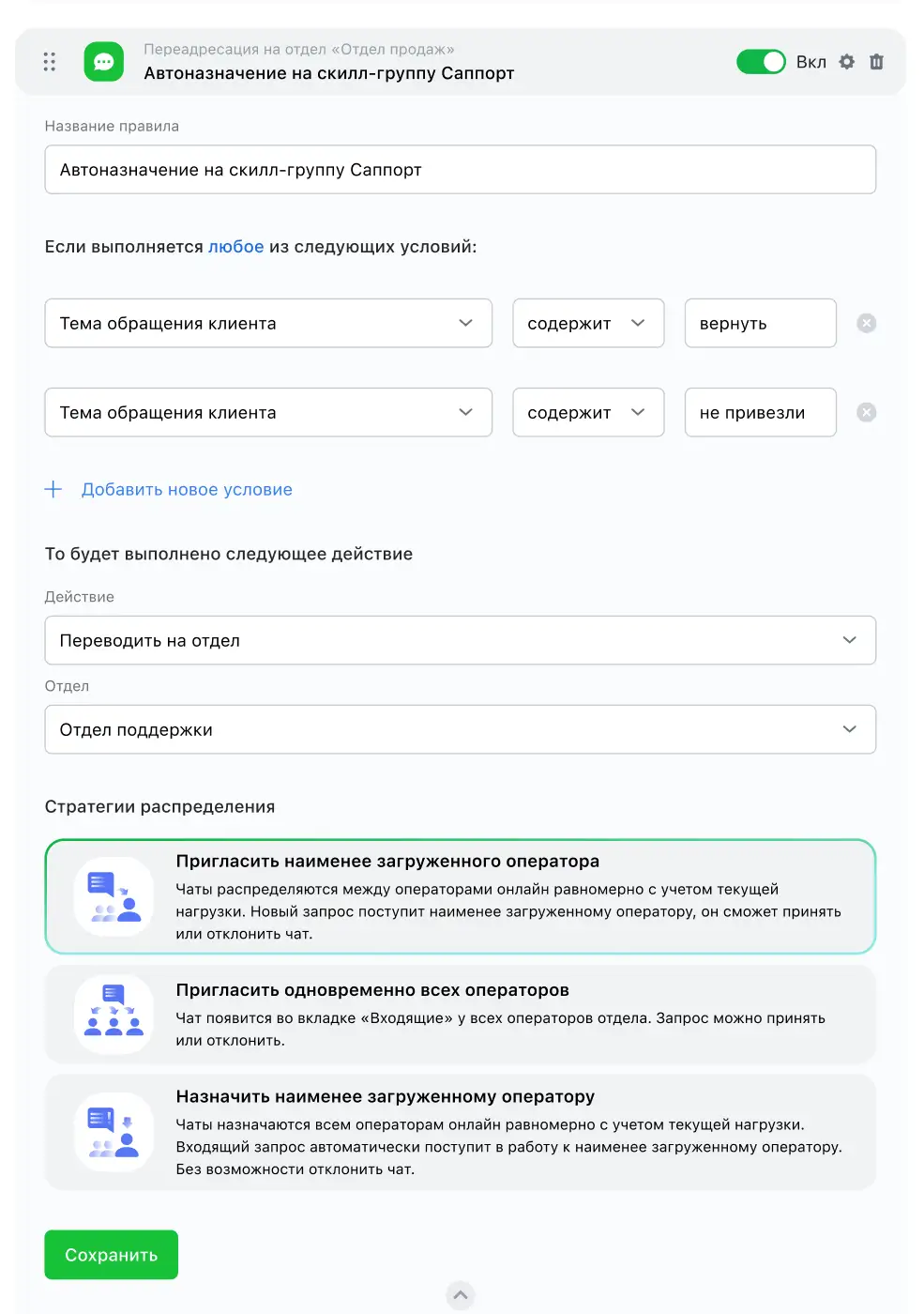 - выбрать стратегию распределения из доступных вариантов: ПРИГЛАСИТЬ ОПЕРАТОРА В ЧАТ или НАЗНАЧИТЬ ЧАТ НА ОПЕРАТОРА;