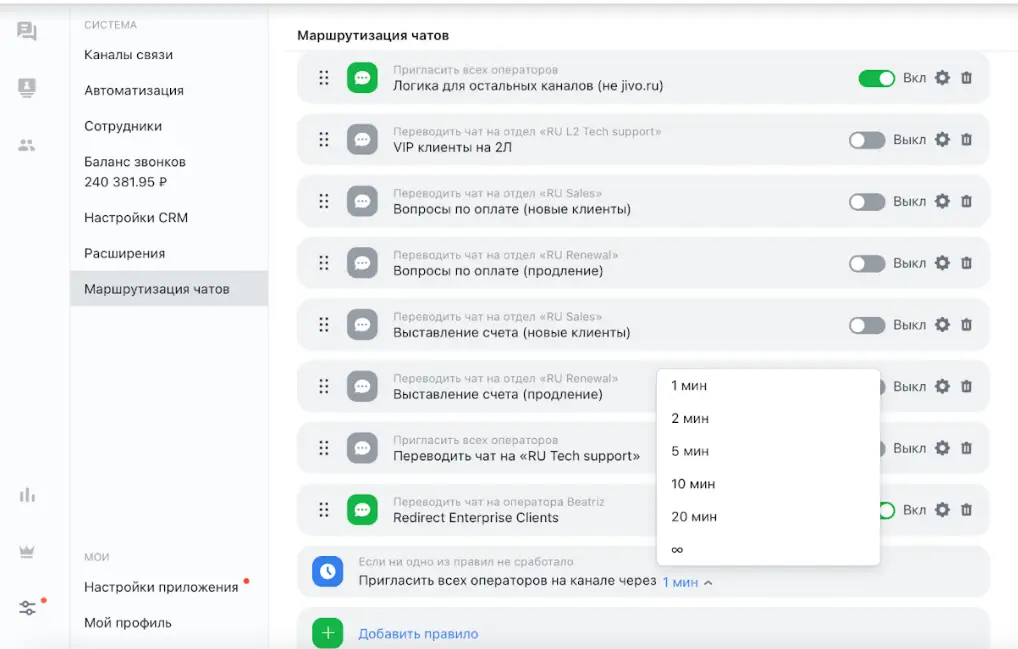 Маршрутизация чатов доступна в Корпоративной версии Jivo. Обратитесь к вашему персональному менеджеру, если уже используете корпоративную версию, или напишите нам в чат, если хотите ее подключить.