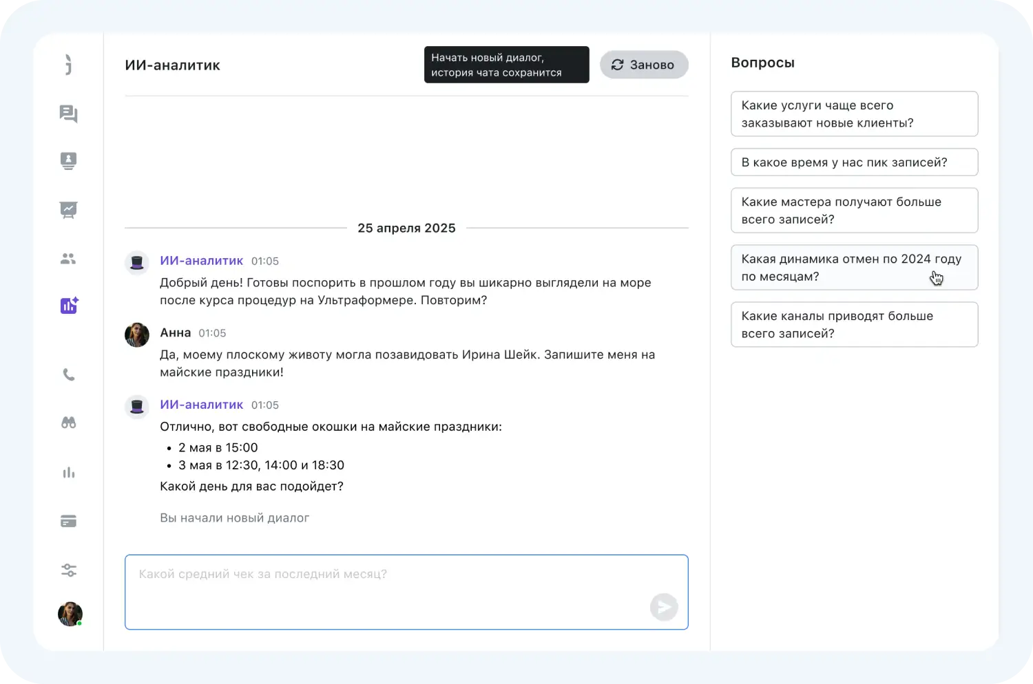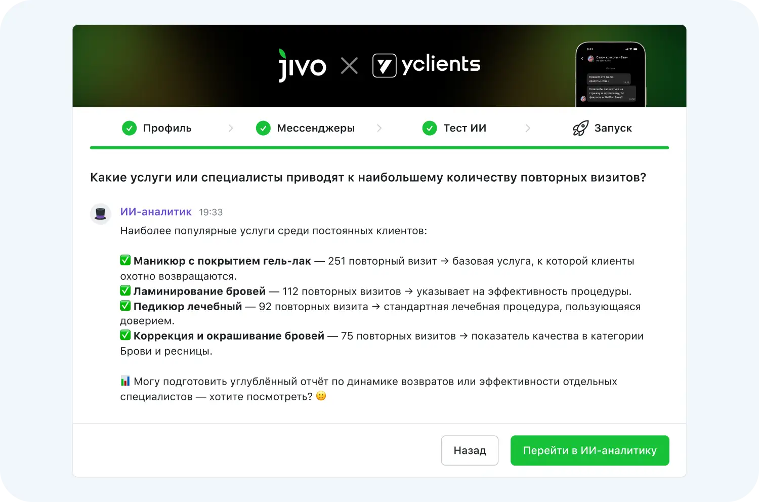 Jivo AI – самый передовой ИИ в бьюти индустрии. Он не только проанализирует данные о клиентах, но и поможет сформировать на их основе маркетинговую стратегию. Вот несколько вопросов, на которые нейросеть подготовит ответ за считанные секунды: