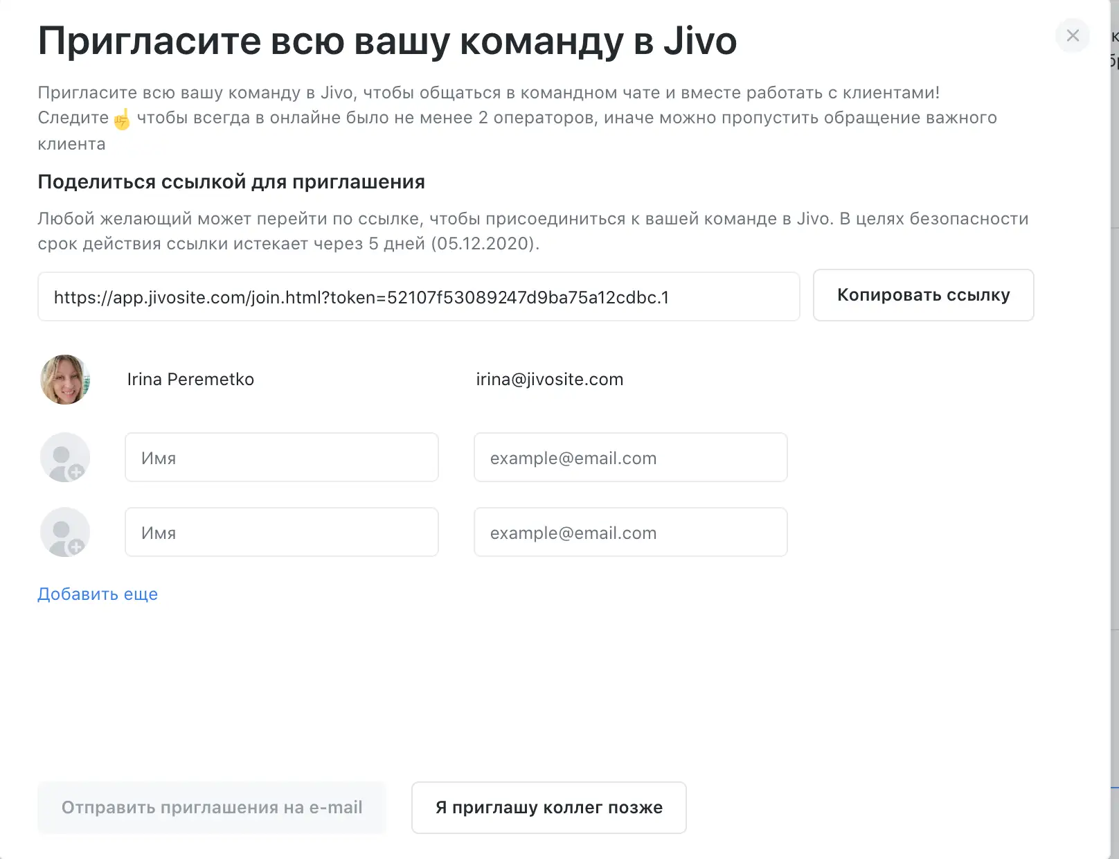 Если хотите пригласить коллег в Jivo, то больше не нужно создавать учётную запись для каждого сотрудника. Просто скопируйте и отправьте ссылку-приглашение.