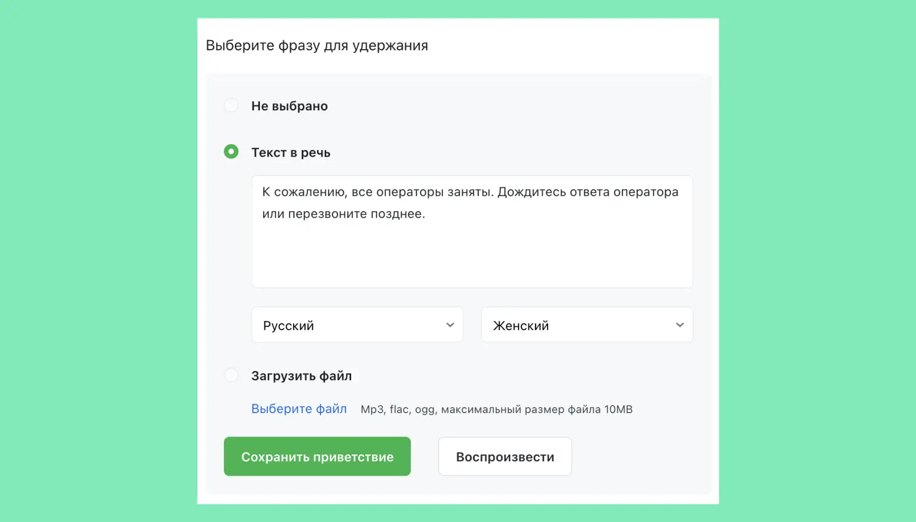 Вы можете добавить собственный аудиофайл (mp3, flac, ogg), который будет звучать во время ожидания ответа. Либо воспользоваться функцией преобразования текста в речь — напечатанная вами фраза будет озвучена нашим роботом.