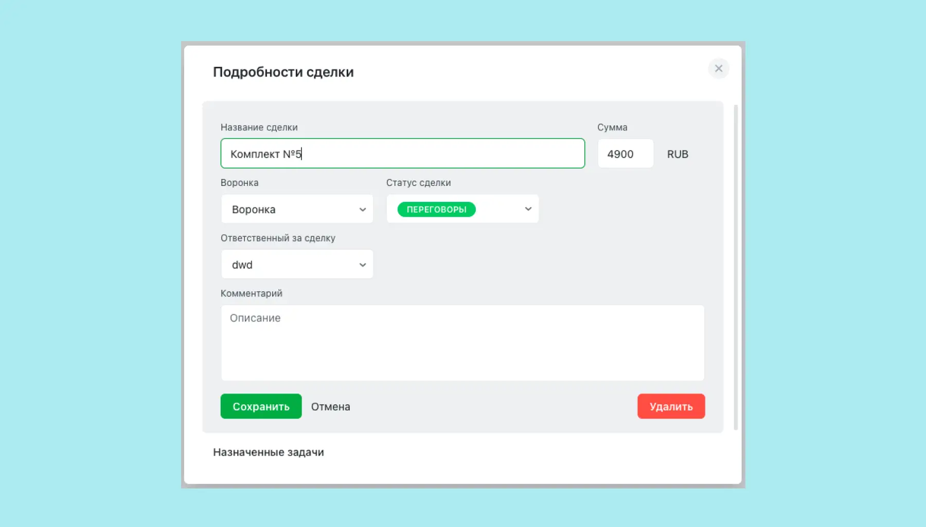 Все мы порой ошибаемся. Поэтому если что-то пошло не так, вы можете удалить сделку, чтобы она не учитывалась в статистике по воронке.