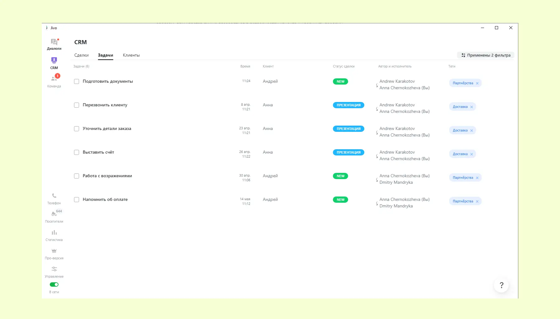 После импорта вы сможете планировать задачи для следующего контакта с клиентом, вести прогресс по сделкам и общаться с помощью электронной почты, SMS, звонков и WhatsApp прямо из Jivo.