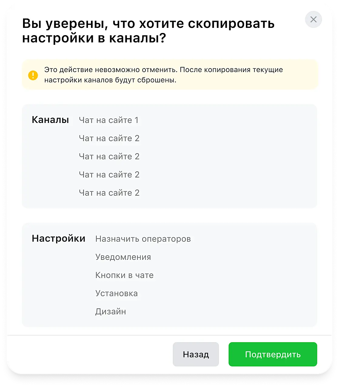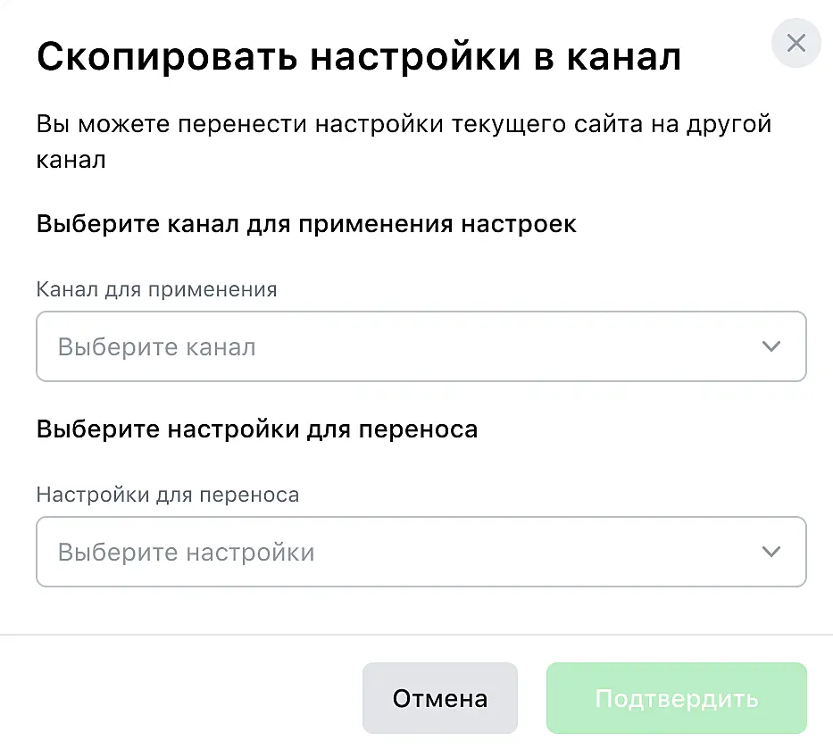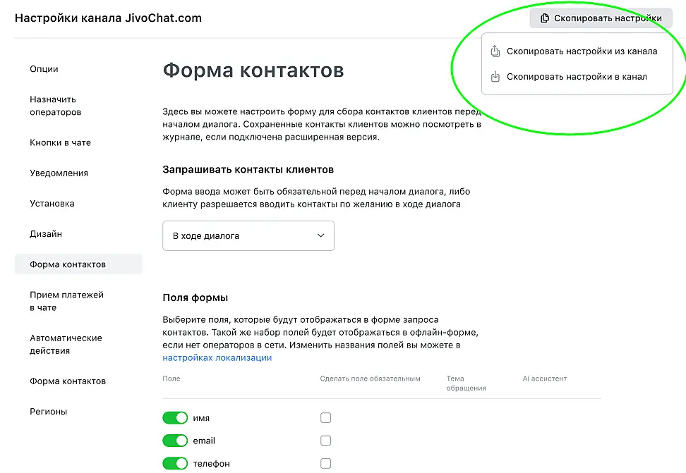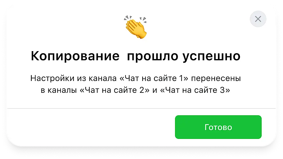 Отличная новость для тех, кто периодически добавляет новые каналы в Jivo и переносит настройки из действующих каналов в новый вручную: теперь вы можете делать это автоматически, а значит, быстрее и с меньшим риском ошибок при переносе.