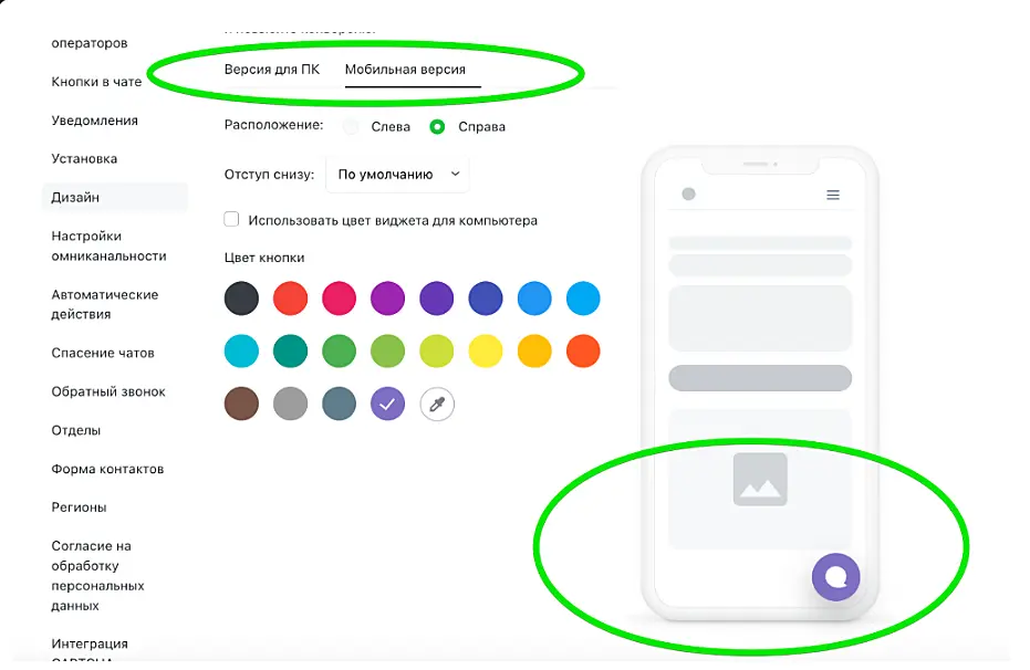 Но мы все упростили! Теперь расположение виджета можно настроить прямо в разделе Дизайн → Мобильная версия в личном кабинете: