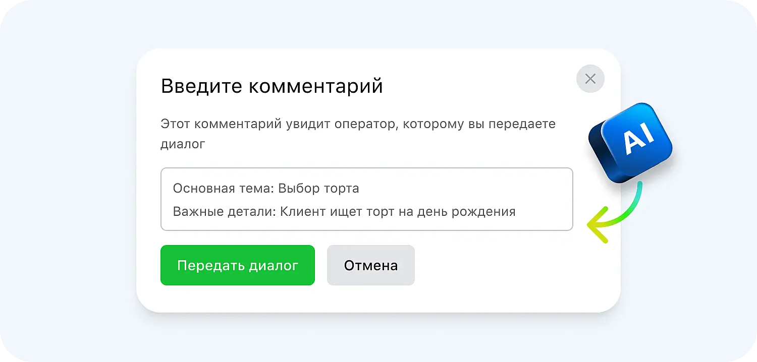 Научили его резюмировать диалоги при передаче между операторами — больше никаких «Подождите минуту, перевожу вас на другой отдел». Если Василий из продаж подключит Сергея из техподдержки, клиент этого даже не заметит, а вопрос будет решен быстрее и эффективнее.
