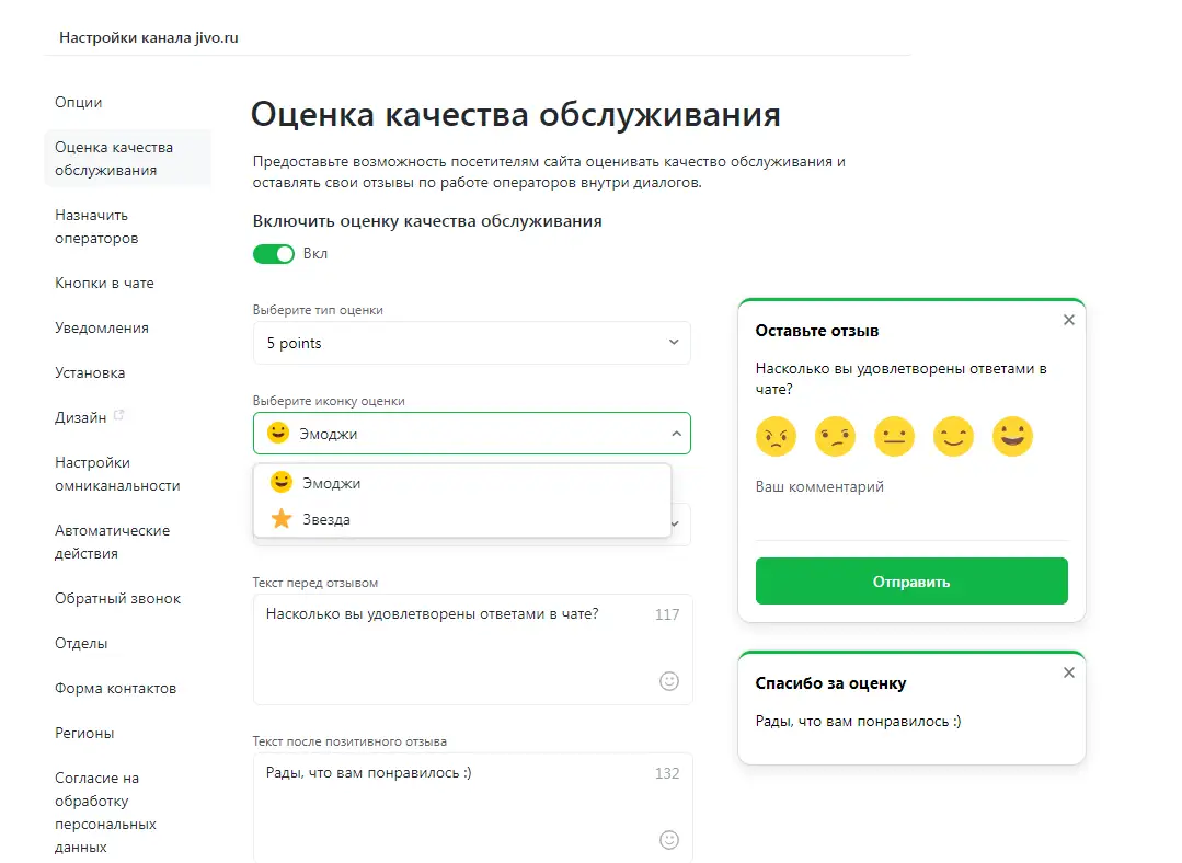 Чтобы настроить параметры оценки, используйте специальный конструктор, расположенный в разделе «Чат на сайте»: