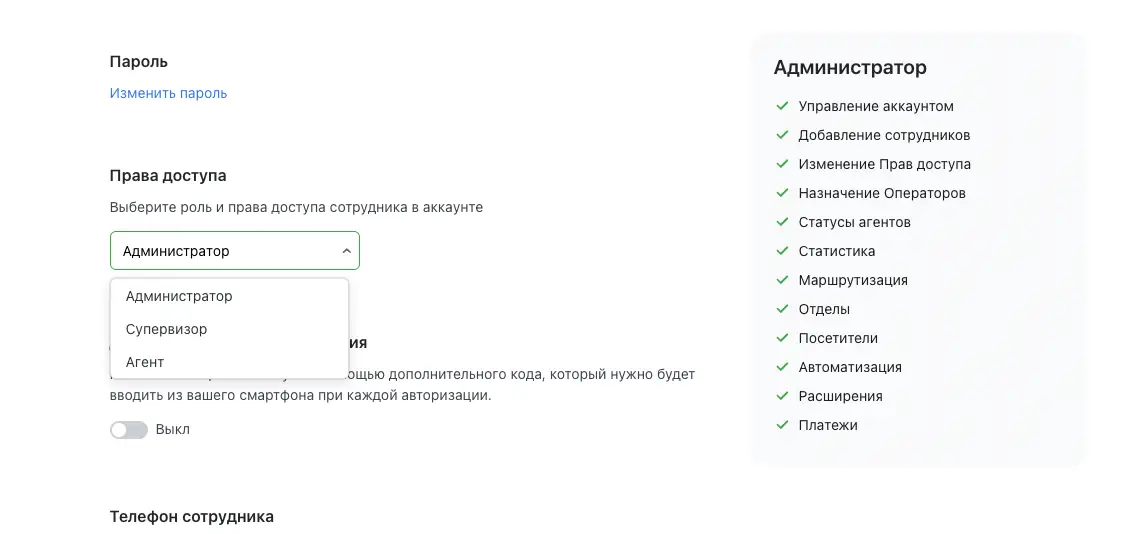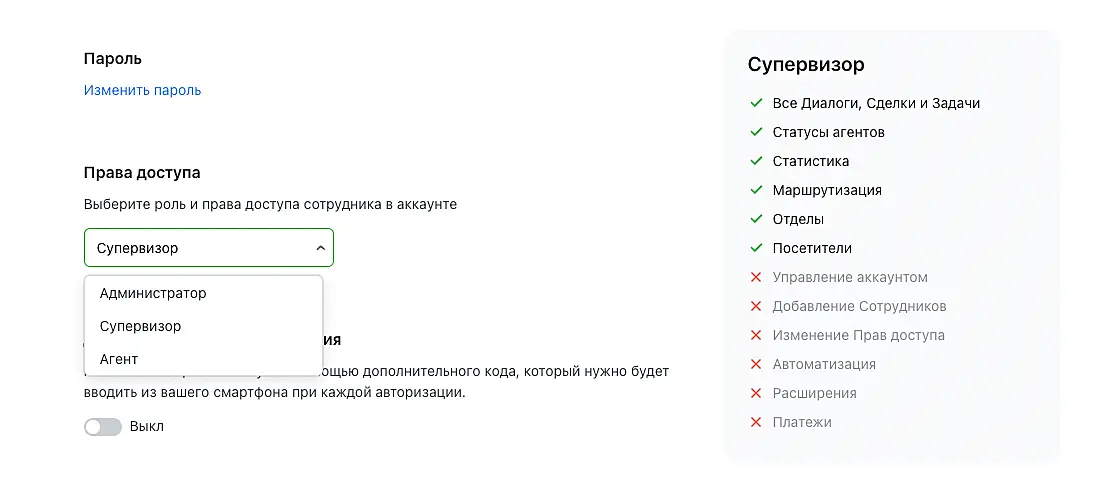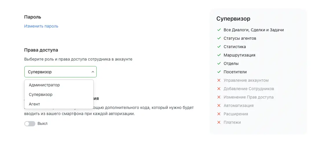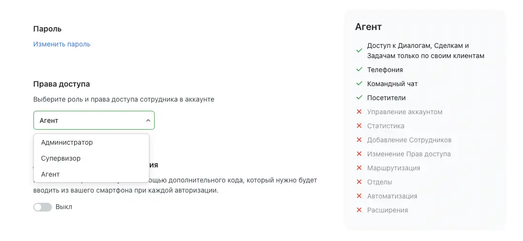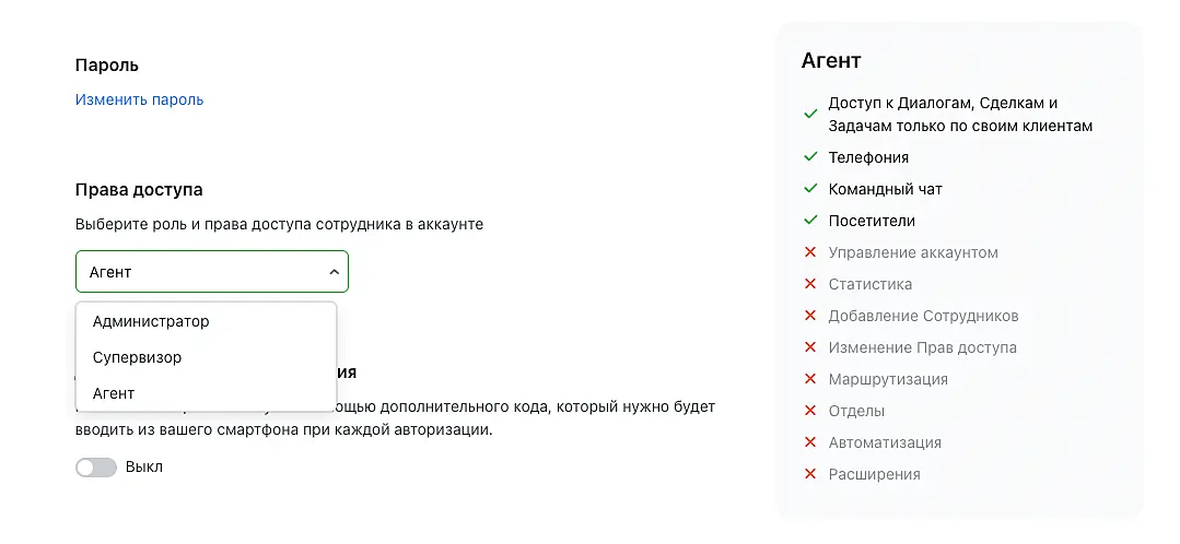 Чтобы ограничить или расширить права и функционал сотрудника, достаточно изменить его роль в настройках профиля. Однако агент не сможет расширить права своей учетной записи самостоятельно, это может сделать только администратор или владелец аккаунта. То же правило действует для администраторов: чтобы изменить свои права, придется обратиться к другому администратору или владельцу.