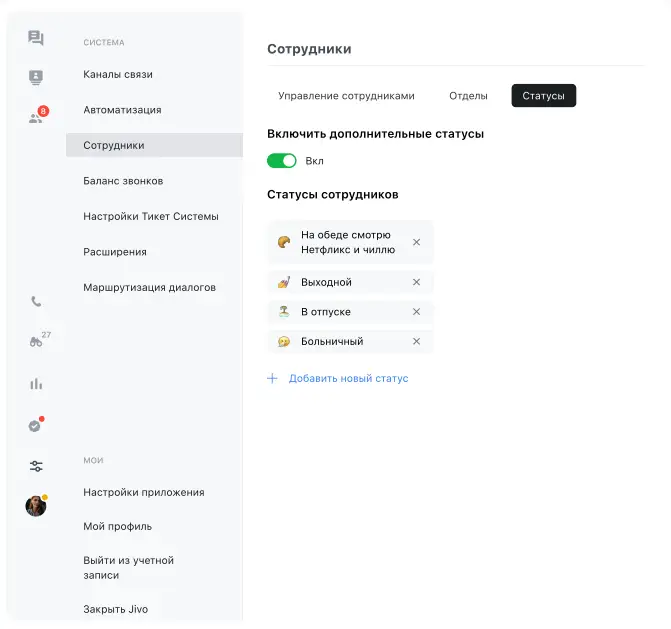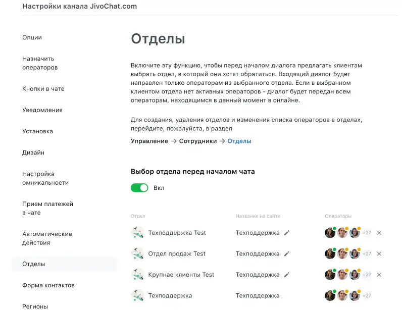 Статусы операторов, оценка качества обслуживания и распределение по отделам доступны в Профессиональной версии Jivo