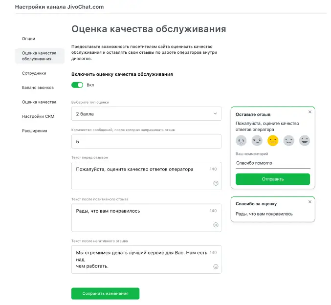 Чтобы настроить параметры оценки, используйте специальный конструктор, расположенный в разделе «Чат на сайте»: