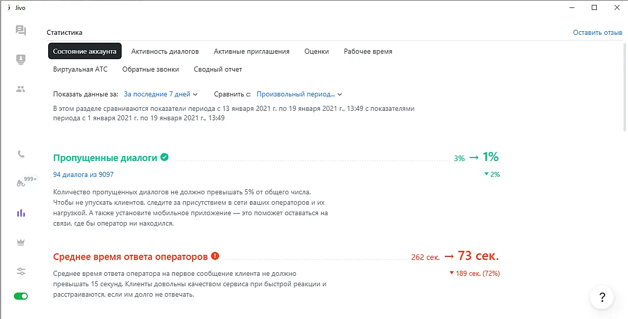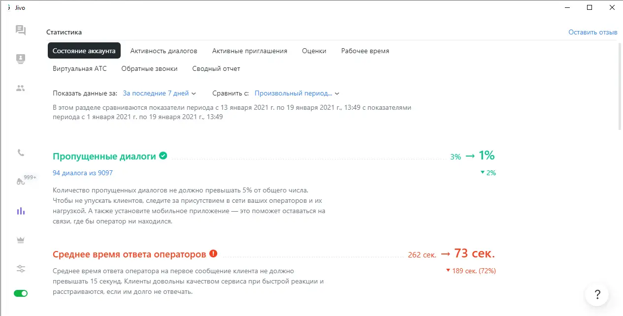 Теперь в разделе «Состояние аккаунта» можно собирать и сравнивать данные за любые промежутки времени. Здесь же вы можете посмотреть информацию по диалогам и звонкам с настроенными фильтрами.