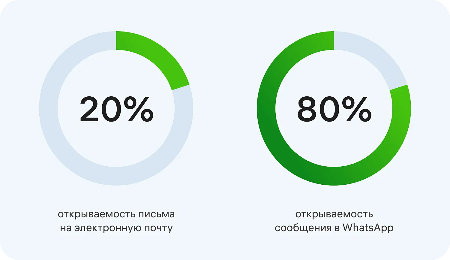 Сообщения в Вотсапе* пользователи, открывают в 80-90% случаев. Открываемость писем, отправленных по электронной почте, гораздо ниже — в среднем она составляет до 30% в зависимости от коммуникации.