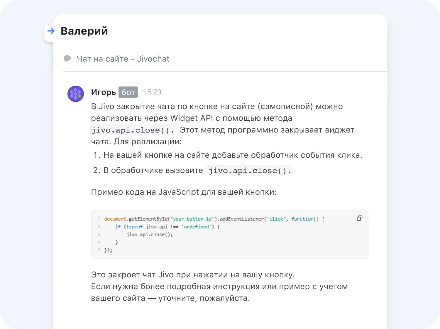 Данный навык AI-оператора упрощает настройку и установку продуктов Jivo на сайте. А еще делает ее более быстрой. В аналогичной ситуации сотрудник службы поддержки потратил бы время на поиск нужной строчки кода в документации, и ответ мог бы занять до 5 минут. AI-оператор справляется с задачей в среднем за 30 секунд.