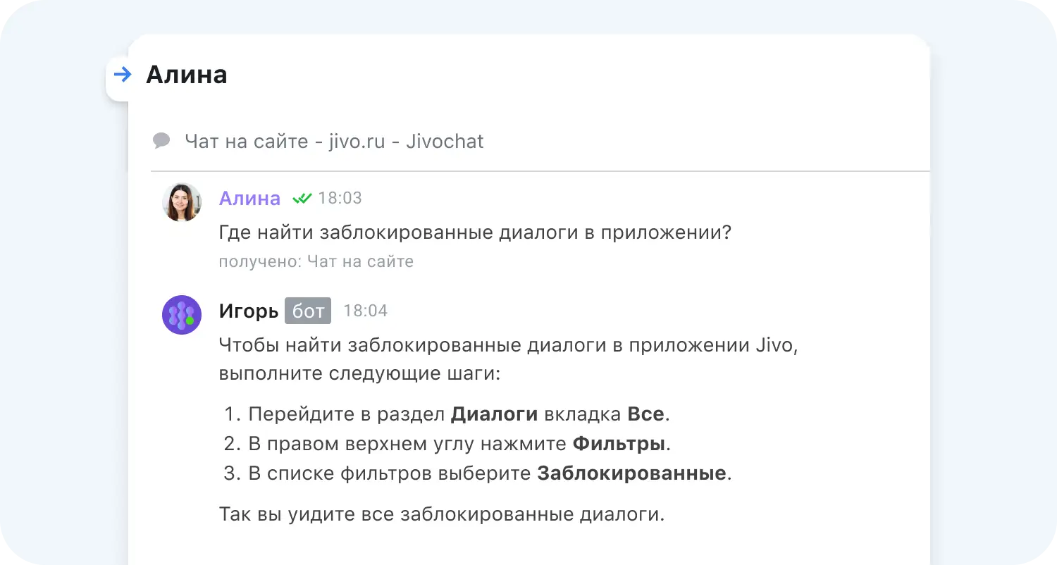 Файл с подробным описанием приложения Jivo добавили в базу знаний AI-операторов. Поэтому теперь, получив вопрос «Где найти заблокированные диалоги в приложении?», AI-оператор отправляется в нужный файл, находит ответ там и передает пользователю инструкцию.