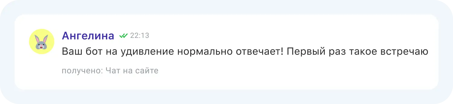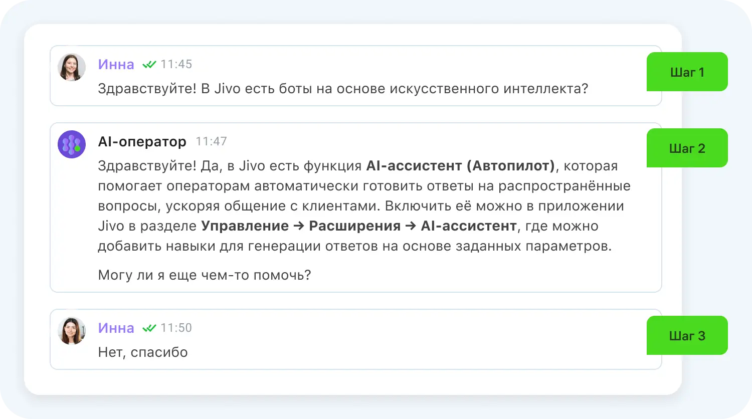 В Jivo мы немного изменили этот сценарий. После просьбы позвать человека AI-оператор уточняет, что именно хочет пользователь, и предлагает свою помощь. Часть клиентов настаивают на своем — и тогда к диалогу подключается человек. Другие же описывают свой запрос и AI-оператор их консультирует. В результате те, кто был скептически настроен к ботам, получают исчерпывающий ответ и нередко меняют свое отношение: