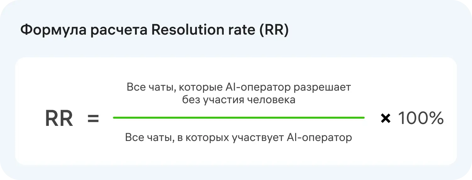 В случае с AI-оператором resolution rate показывает долю диалогов, которые были завершены без участия человека. Она отражает, в каком количестве случаев для решения вопроса пользователя было достаточно общения исключительно с нейросетью.