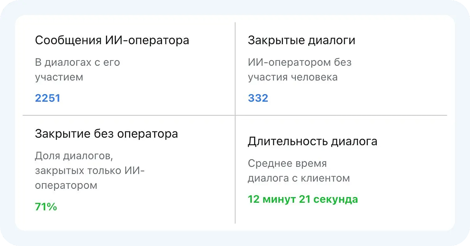 Стоит отметить, что ИИ-оператор хорошо удерживает логику даже в длинных диалогах: может вести переписку длительностью до 10–15 минут без участия сотрудника.