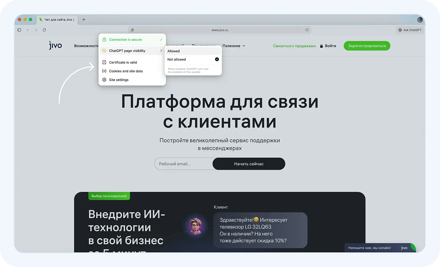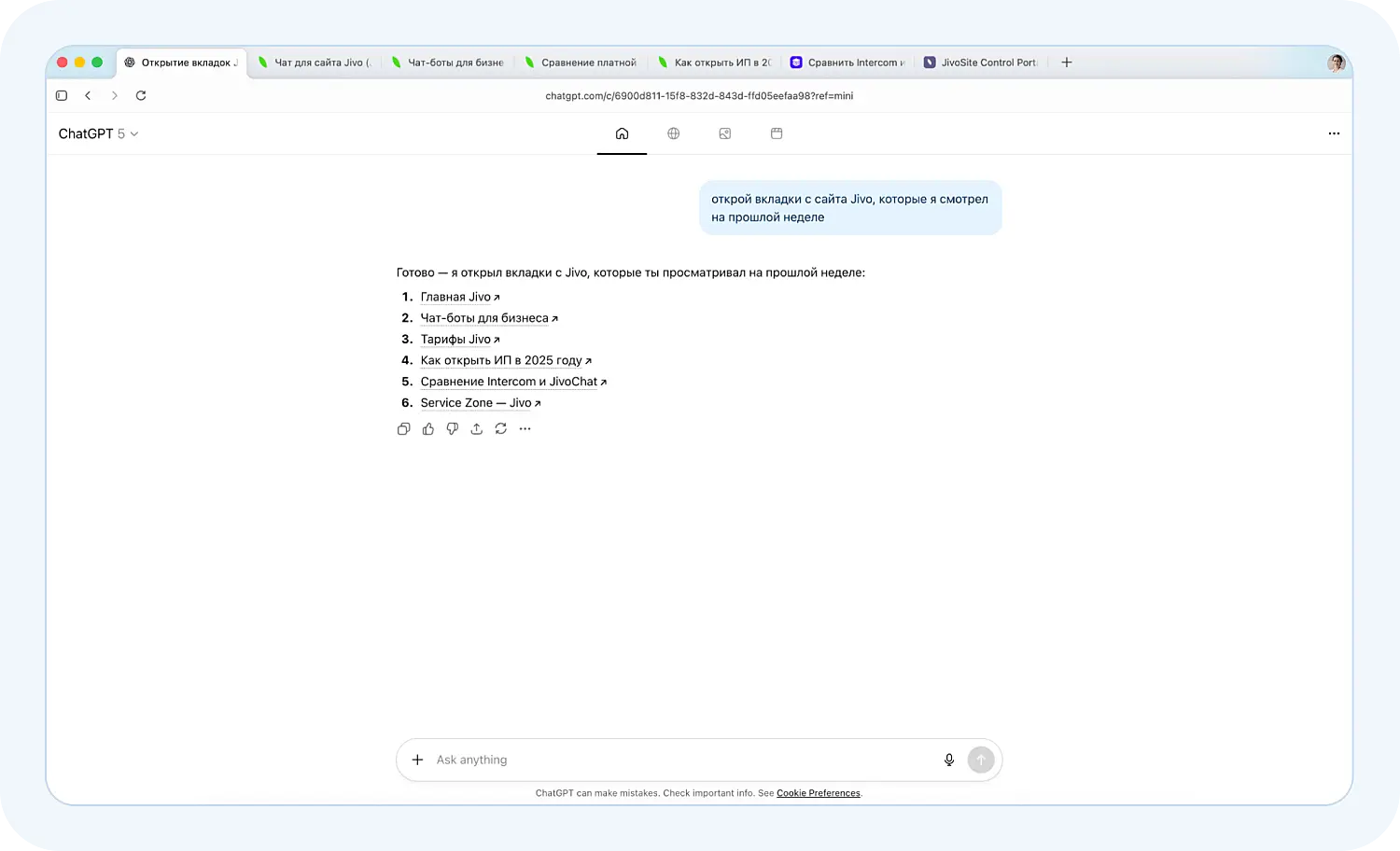 В обычном браузере чтобы найти страницу, на которую вы заходили несколько дней назад, приходится листать историю всех посещенных страниц. В ИИ браузере Atlas это можно сделать просто написав промпт «Открой вкладки с сайта Jivo, которые я смотрел на прошлой неделе».