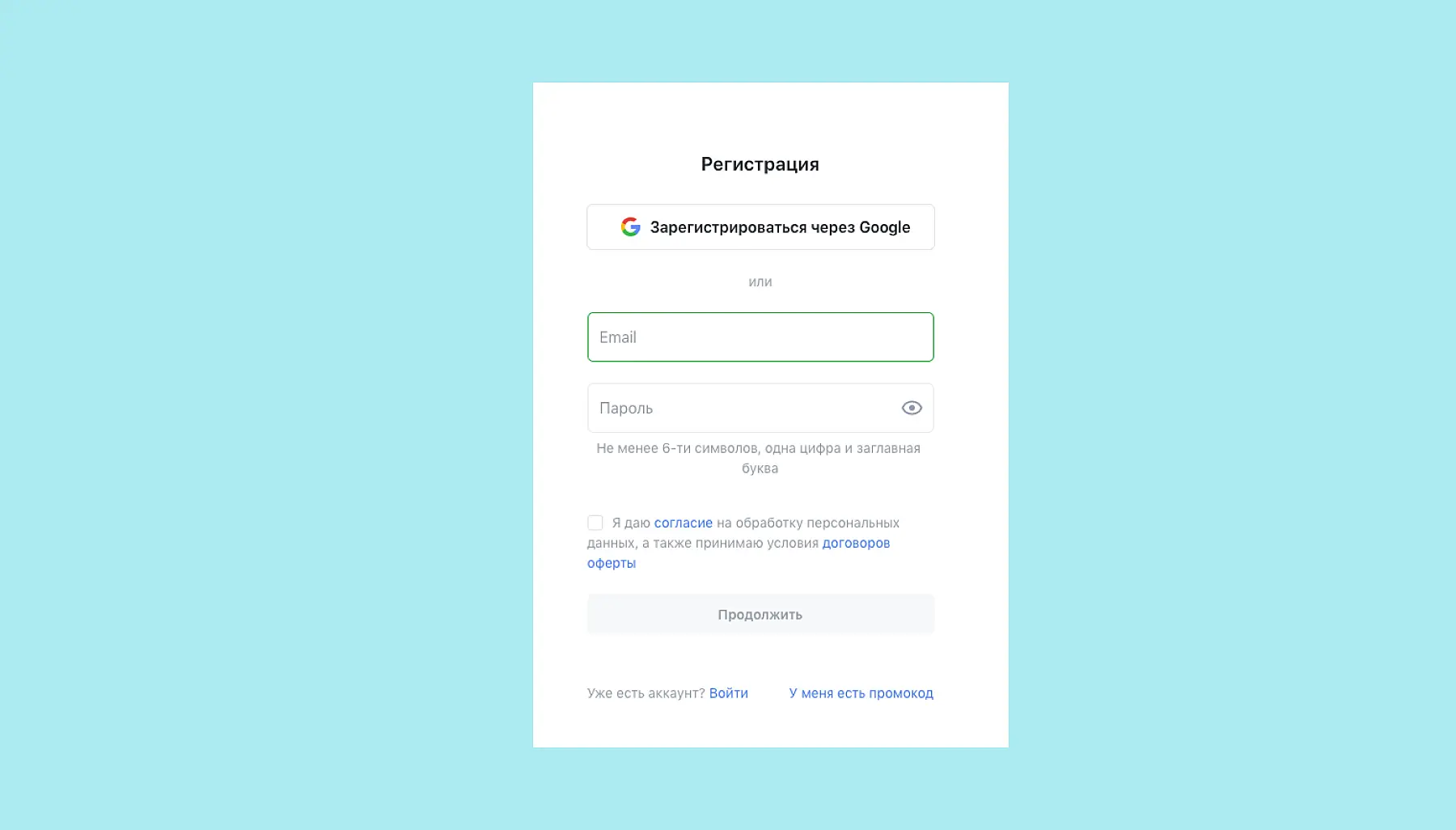 Форма регистрации в Jivo. Для начала мы просим указать электронную почту и придумать пароль. Обо всех нюансах работы с персональными данными рассказываем по ссылке в согласии на обработку.