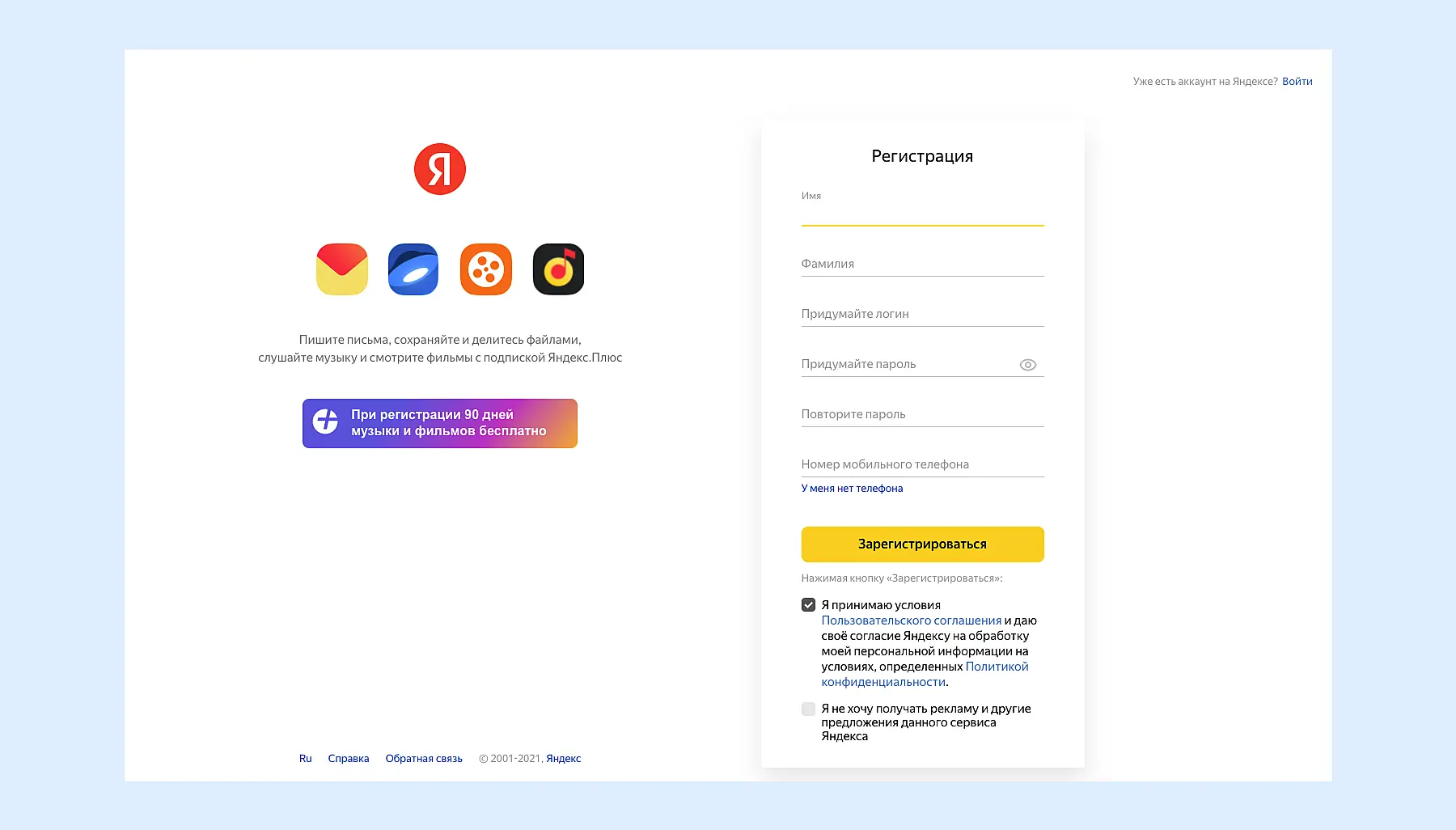 Форма регистрации электронной почты в Яндексе. Все данные, которые нужно указать — персональные. Ниже требуется обязательно дать согласие на их использование и обработку.