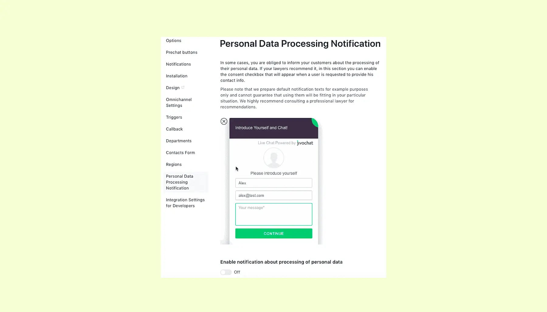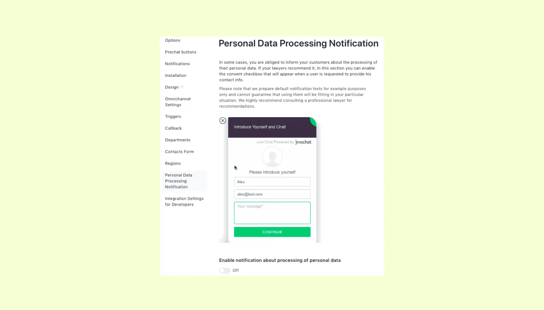 Как владелец сайта, подпадающего под действие GDPR, вы должны сообщить своим клиентам, что будете собирать их персональные данные. Первое, что необходимо сделать — включить уведомление об обработке данных. Так клиенты гарантированно будут осведомлены и смогут дать свое согласие. Инструкцию по настройке чата для соблюдения GDPR мы собрали на отдельной странице.