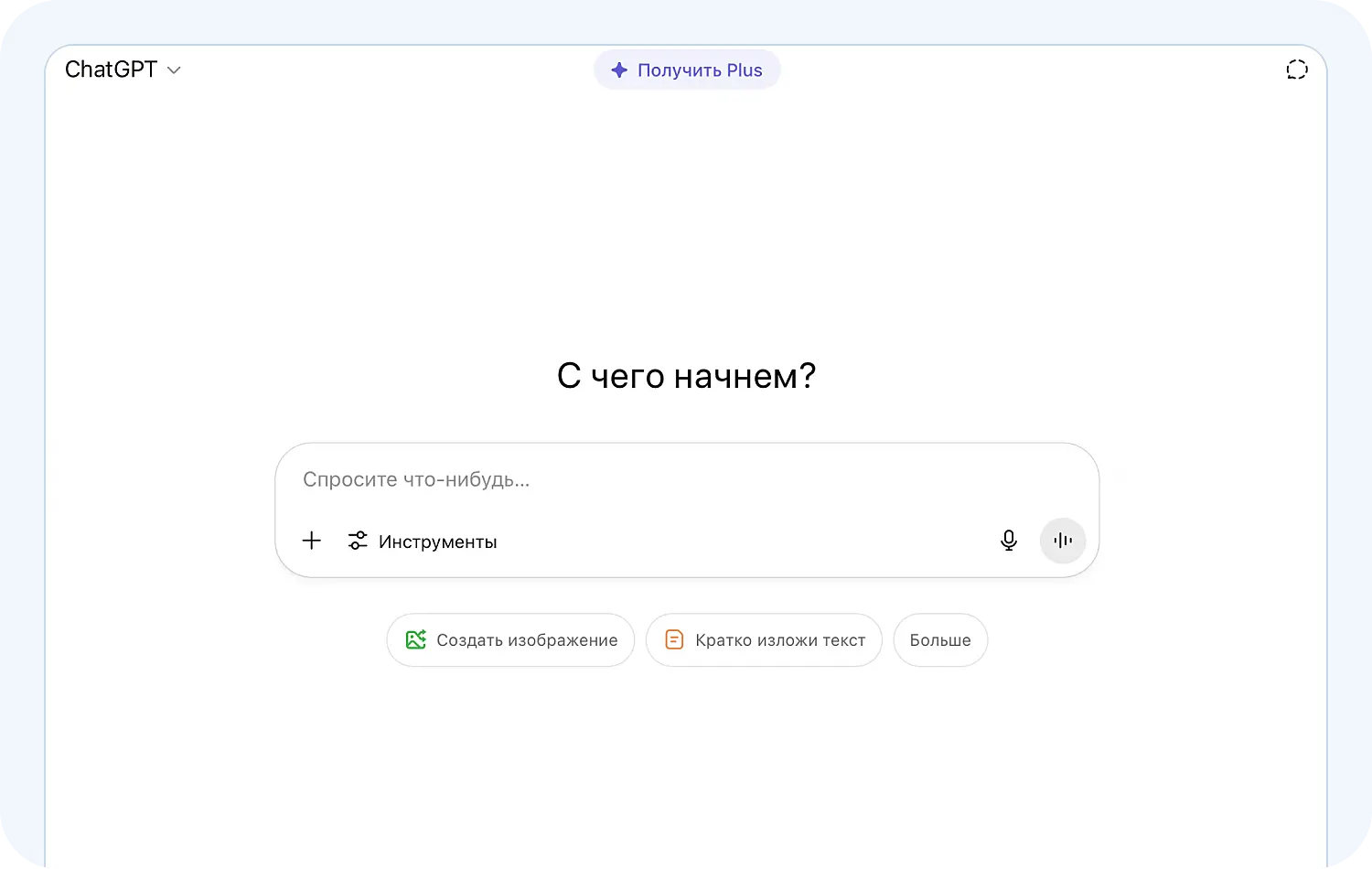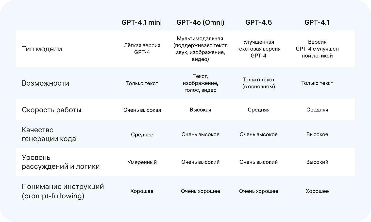 Для знакомства с ChatGPT на повседневных рабочих задачах подойдут модели GPT-4.1 mini и GPT-4o. Для более сложных бизнес-процессов подойдут модели GPT-4.5 и GPT-4.1.