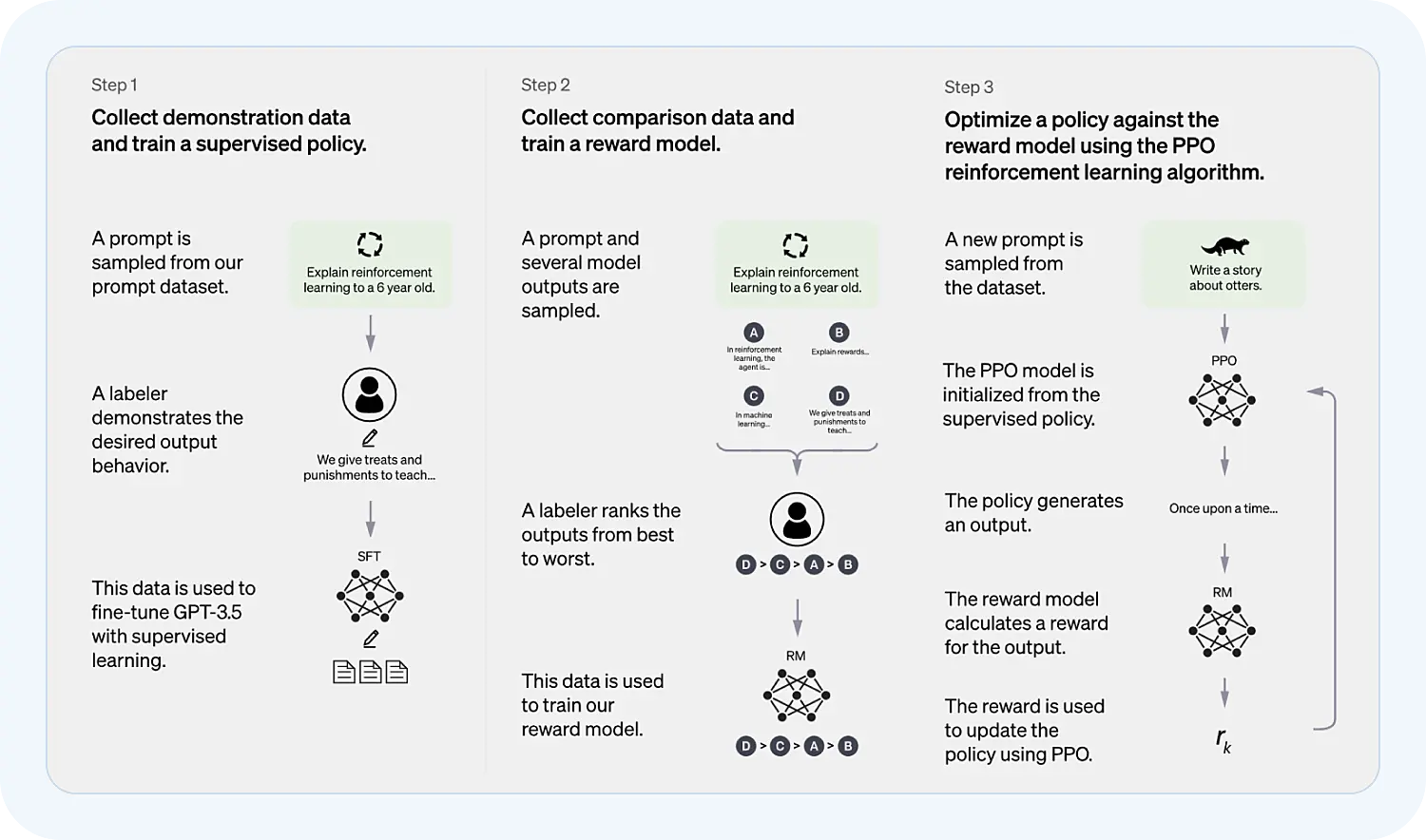 Еще одна важная особенность Chat GPT — применяемая с 2022 года методология обучения моделей RLHF, что расшифровывается как «Обучение с подкреплением на основе отзывов людей».