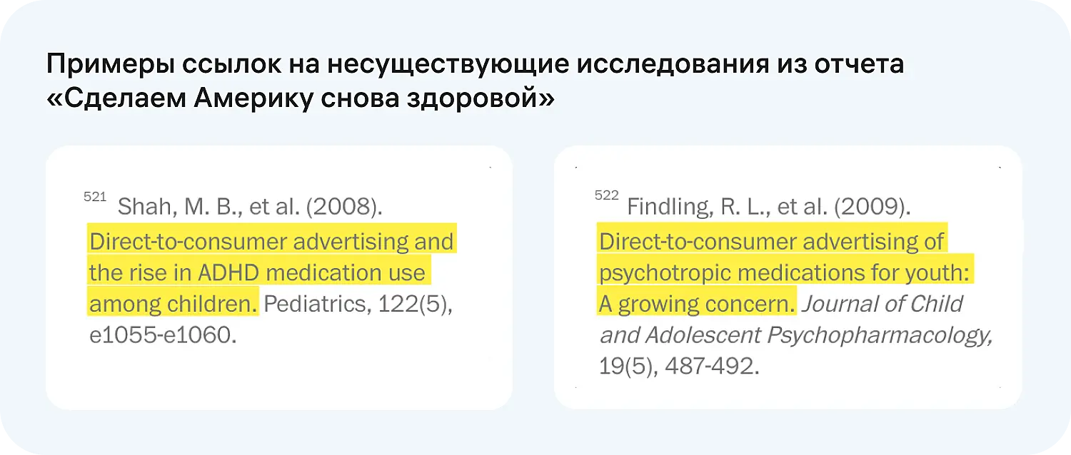 С этой проблемой сталкиваются в том числе профессионалы своего дела. Например, в мае 2025 года министерство здравоохранения США выпустило отчет «Сделаем Америку снова здоровой». Вскоре обнаружилось, что часть ссылок в докладе ведет к несуществующим научным работам. Журналисты предположили, что это произошло при использовании ChatGPT для написания доклада.