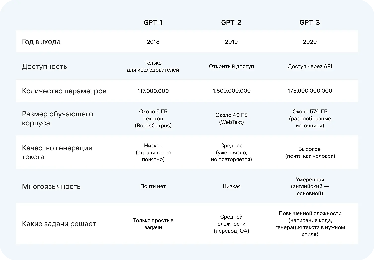 До создания самого ChatGPT компания выпустила несколько моделей, которые обладали похожими функциями: GPT-1, GPT-2 и GPT-3.