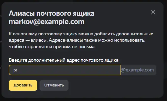 - Для каждого адреса можно создать до 10 алиасов. Это альтернативные адреса, которые нужны, например, чтобы сотрудник получал почту, приходящую не только на его рабочий адрес, но и на адрес pr@name.ru.