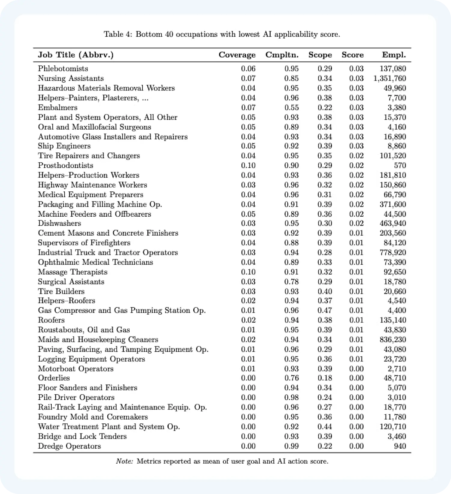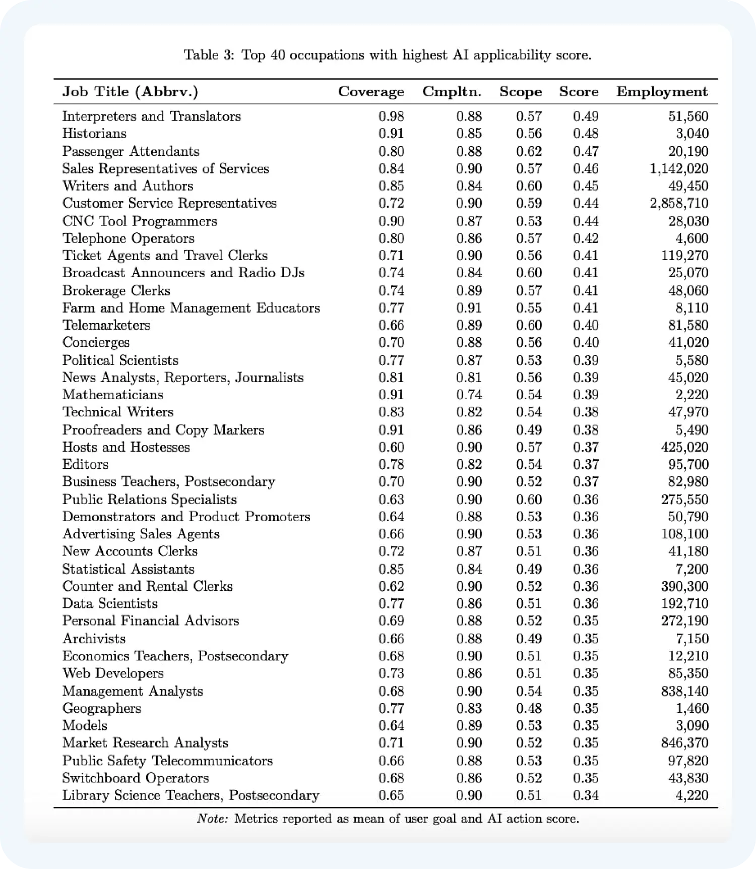 По сети разлетелись две таблицы из этого отчета. В различных медиа утверждали, что в первой таблице собраны профессии, которые с наиболее высокой вероятностью заменит искусственный интеллект.