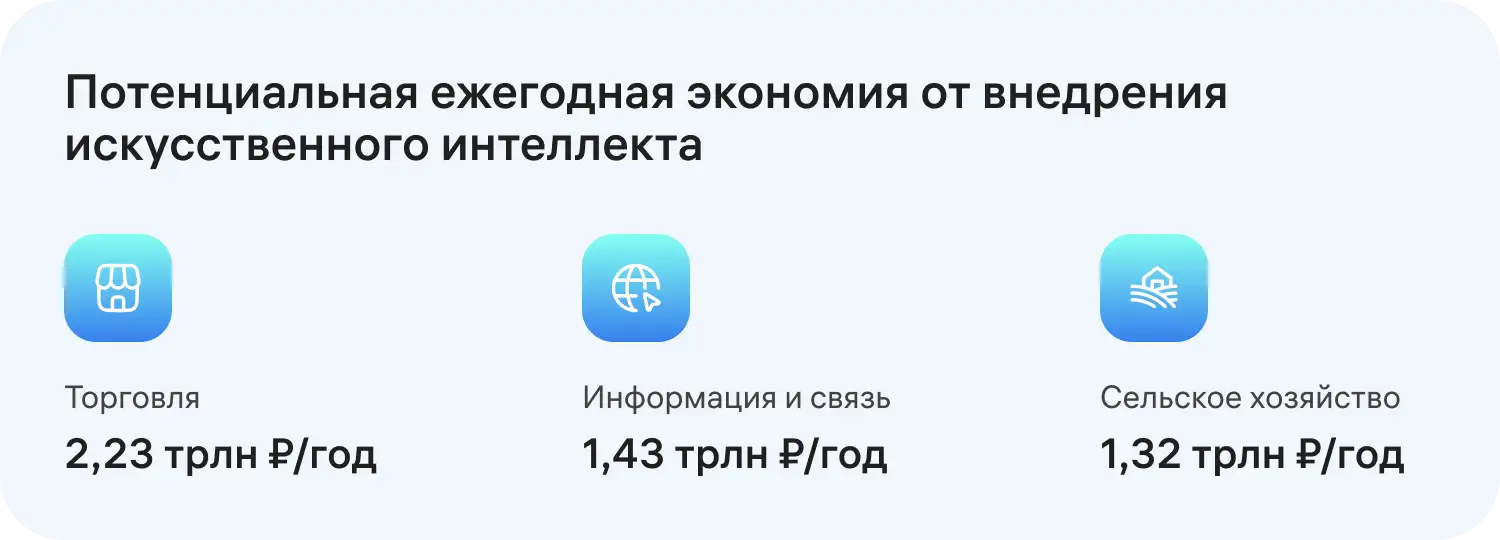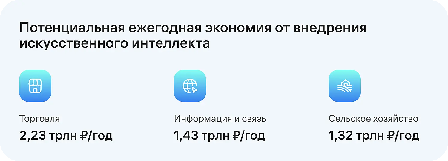 Потенциальная ежегодная экономия от внедрения искусственного интеллекта в российской экономике может достичь 10,8 трлн рублей к 2030 году. Самый большой эффект в абсолютных цифрах прогнозируется для: