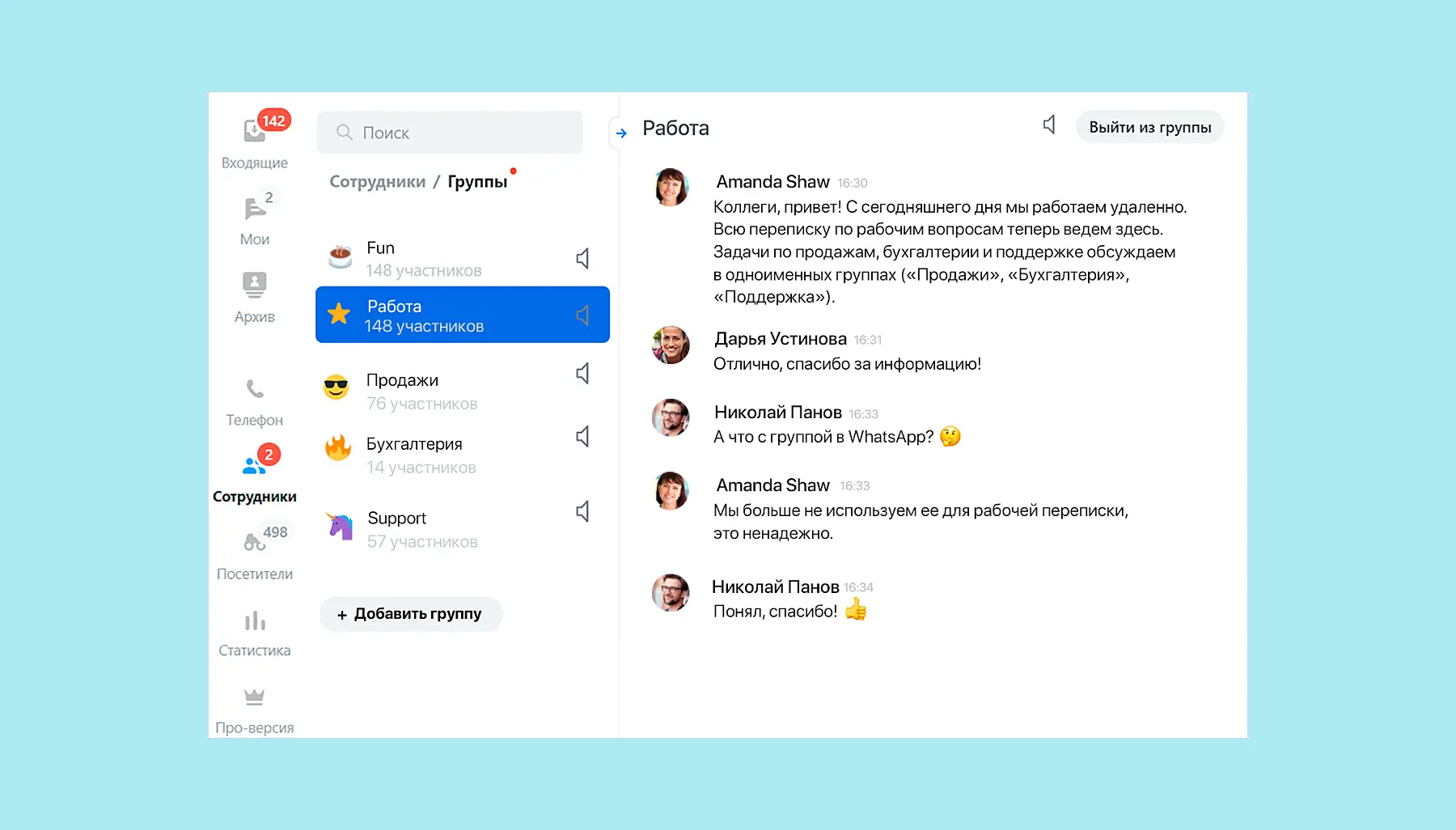 Пользоваться чатами Jivo так же просто, как и привычными мессенджерами. Любой участник команды может добавить новых сотрудников в группу, и они будут сразу на связи с командой. При этом есть очевидные преимущества для бизнеса. К примеру, если сотрудник уволится, то доступ к перепискам быстро отключит администратор. Человек больше не сможет просматривать историю сообщений, скачивать файлы и общаться с коллегами.