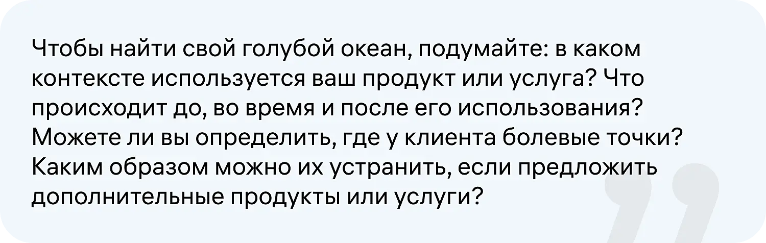 Голубой океан — это создание индивидуального рынка. Чтобы продукт попал в голубой океан, ему не нужно соперничать с известными товарами, так как его создатели могу посмотреть в другую сторону и проанализировать, какой продукт стоит предложить клиентам.