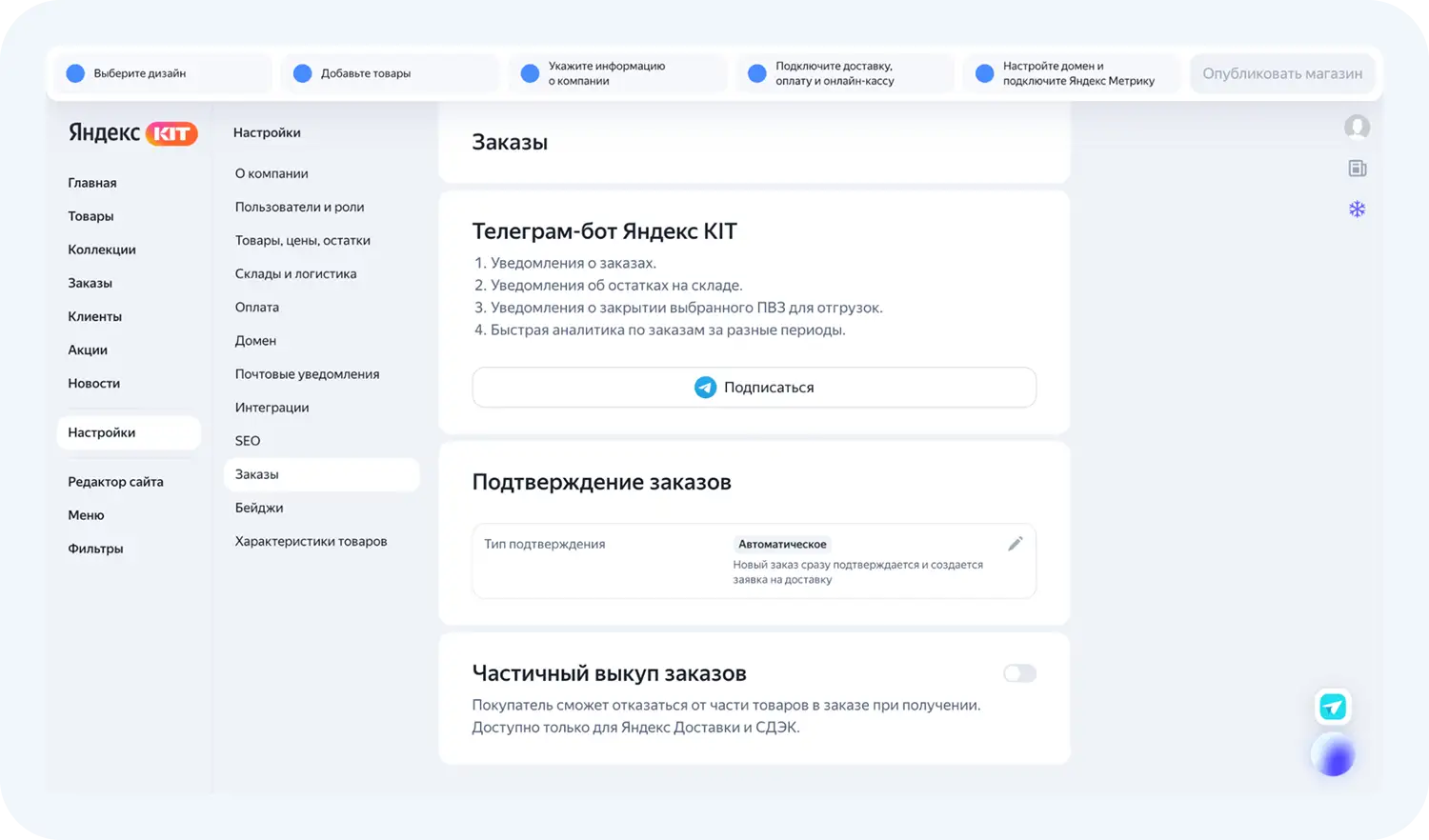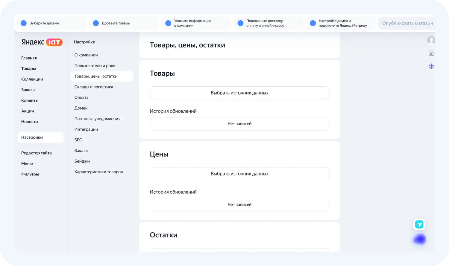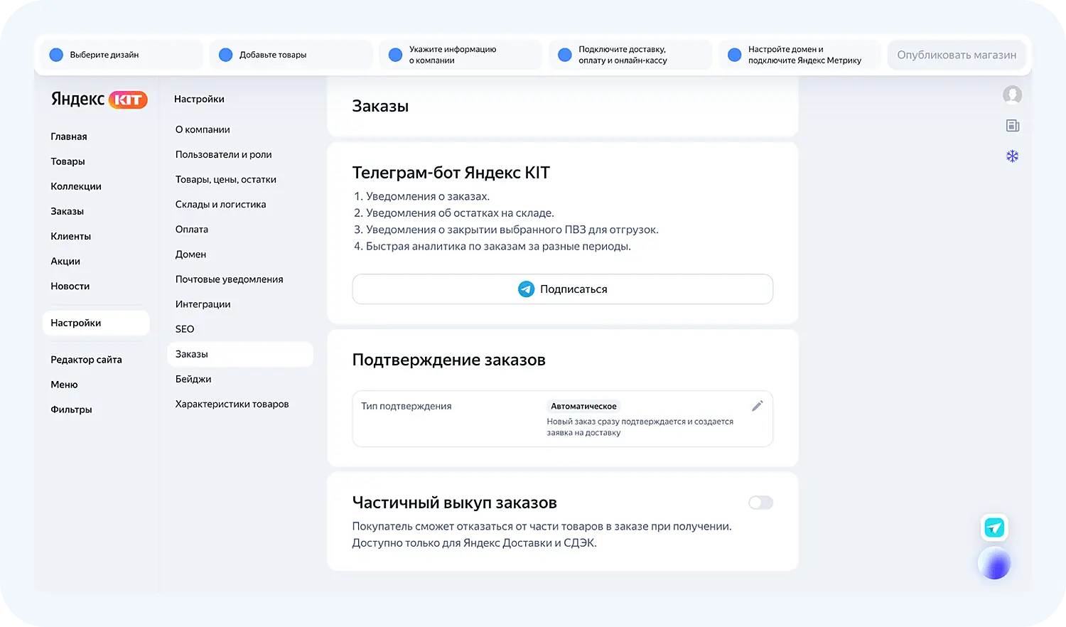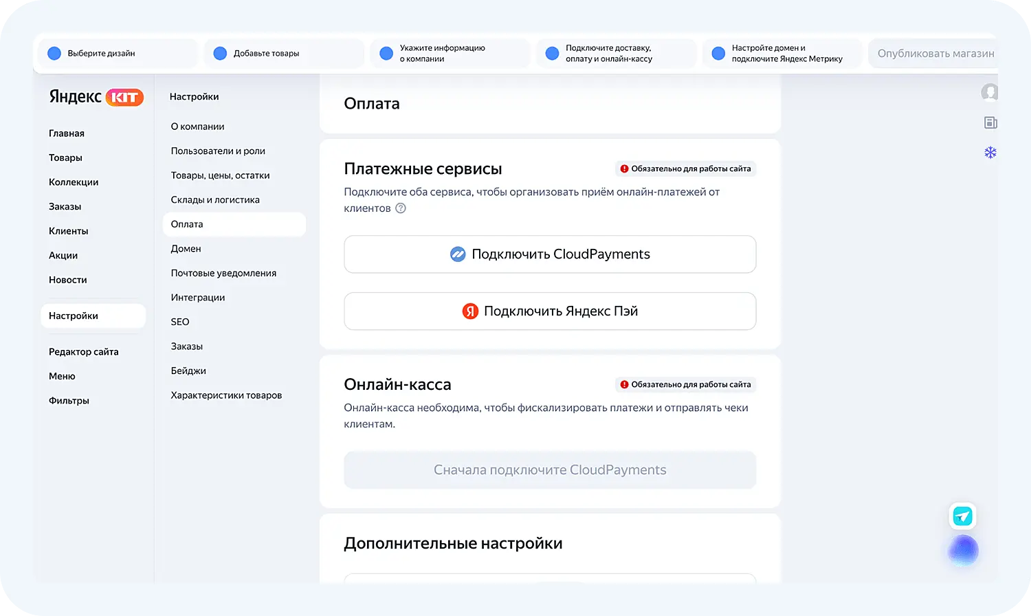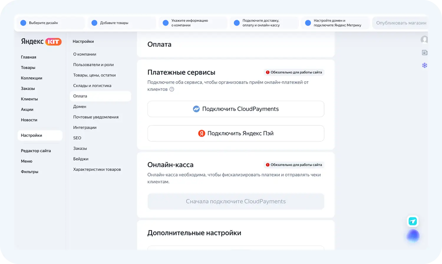 Внутри сервиса есть разделы, которые необходимо заполнить перед публикацией магазина. Проведем обзор Яндекс КИТ.