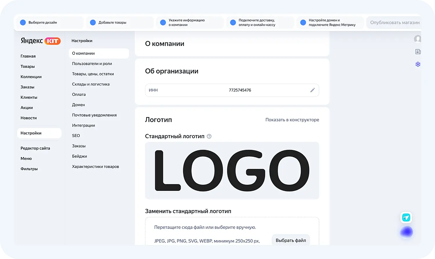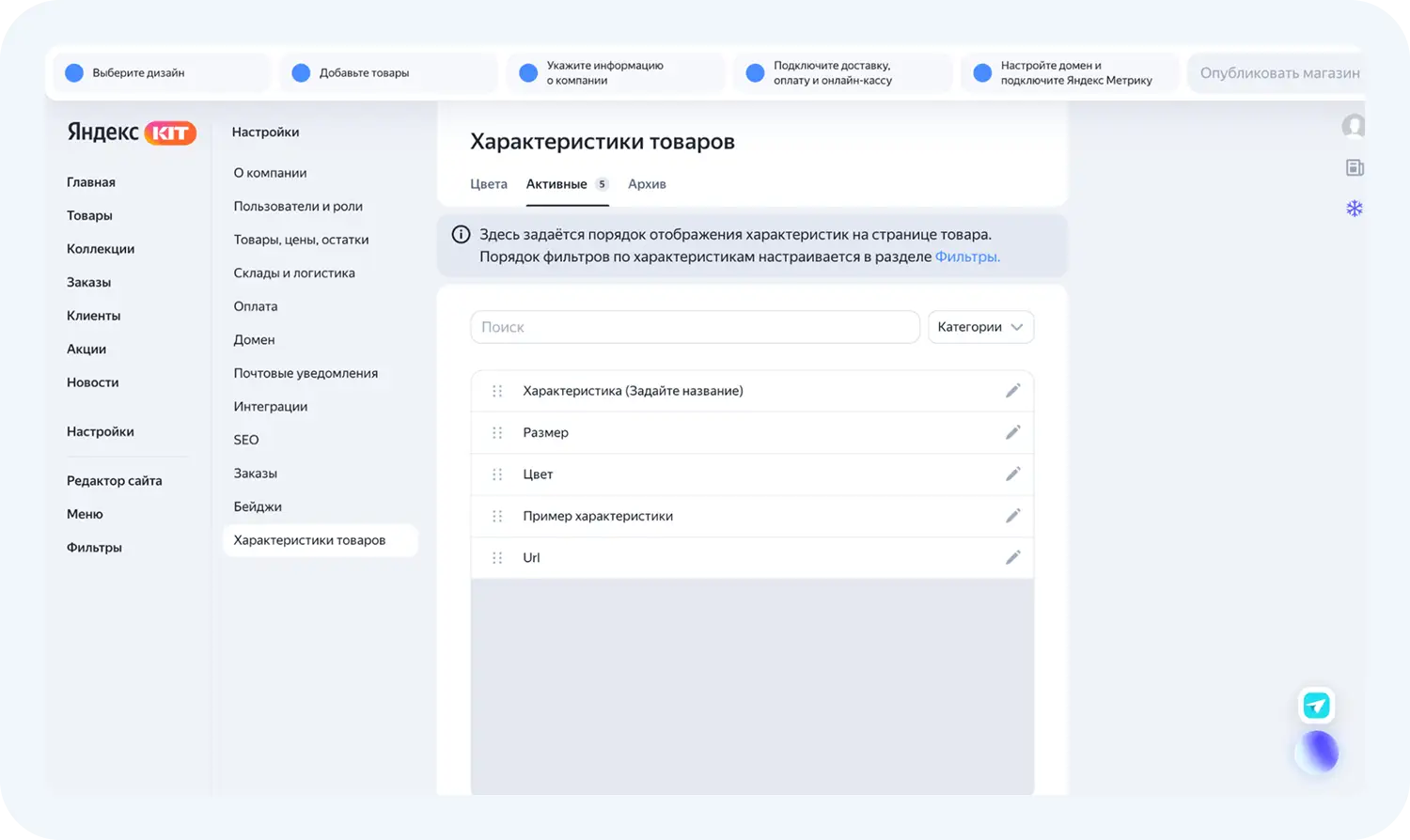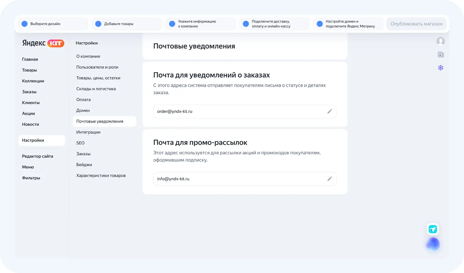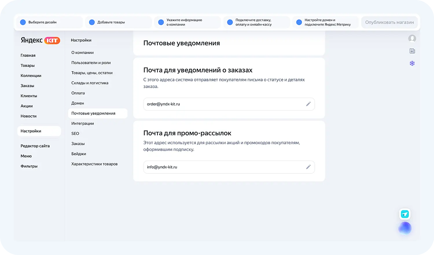 Внутри сервиса есть разделы, которые необходимо заполнить перед публикацией магазина. Проведем обзор Яндекс КИТ.