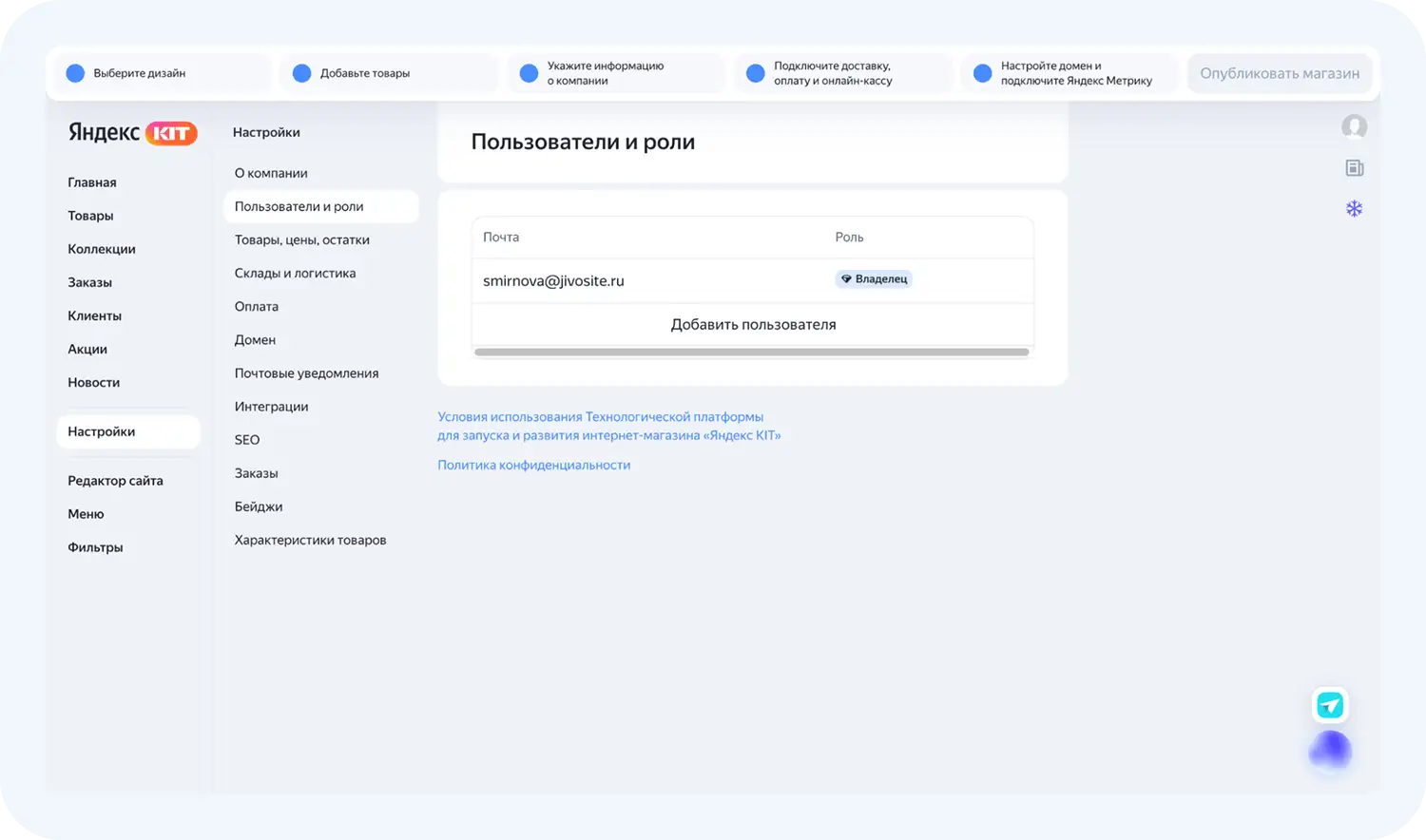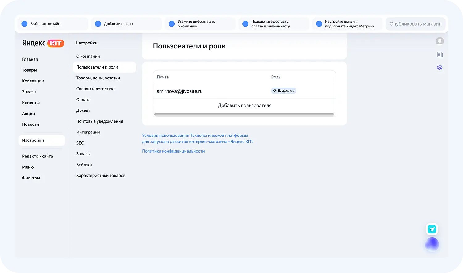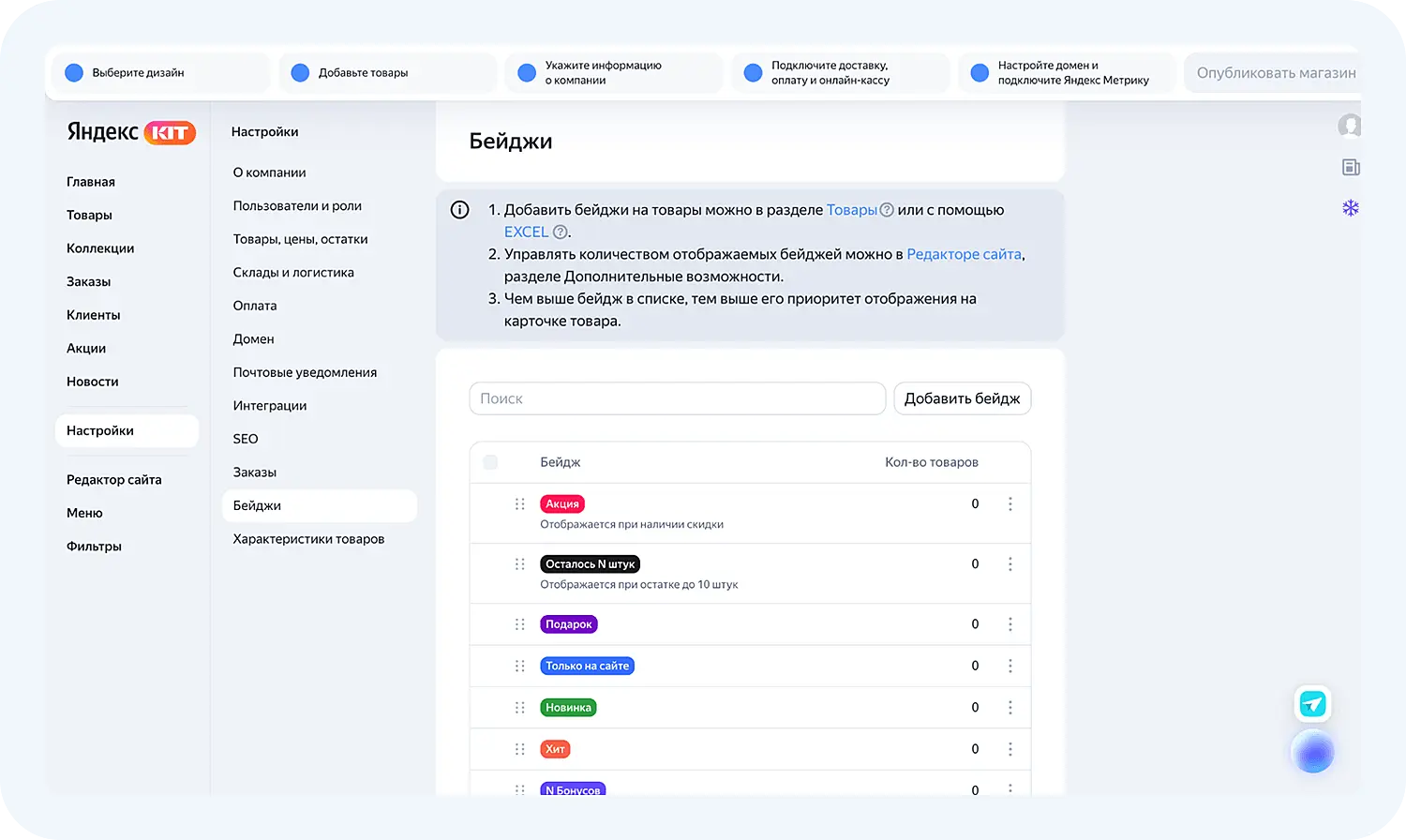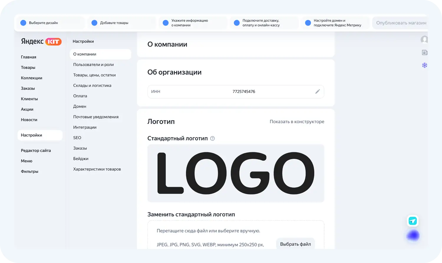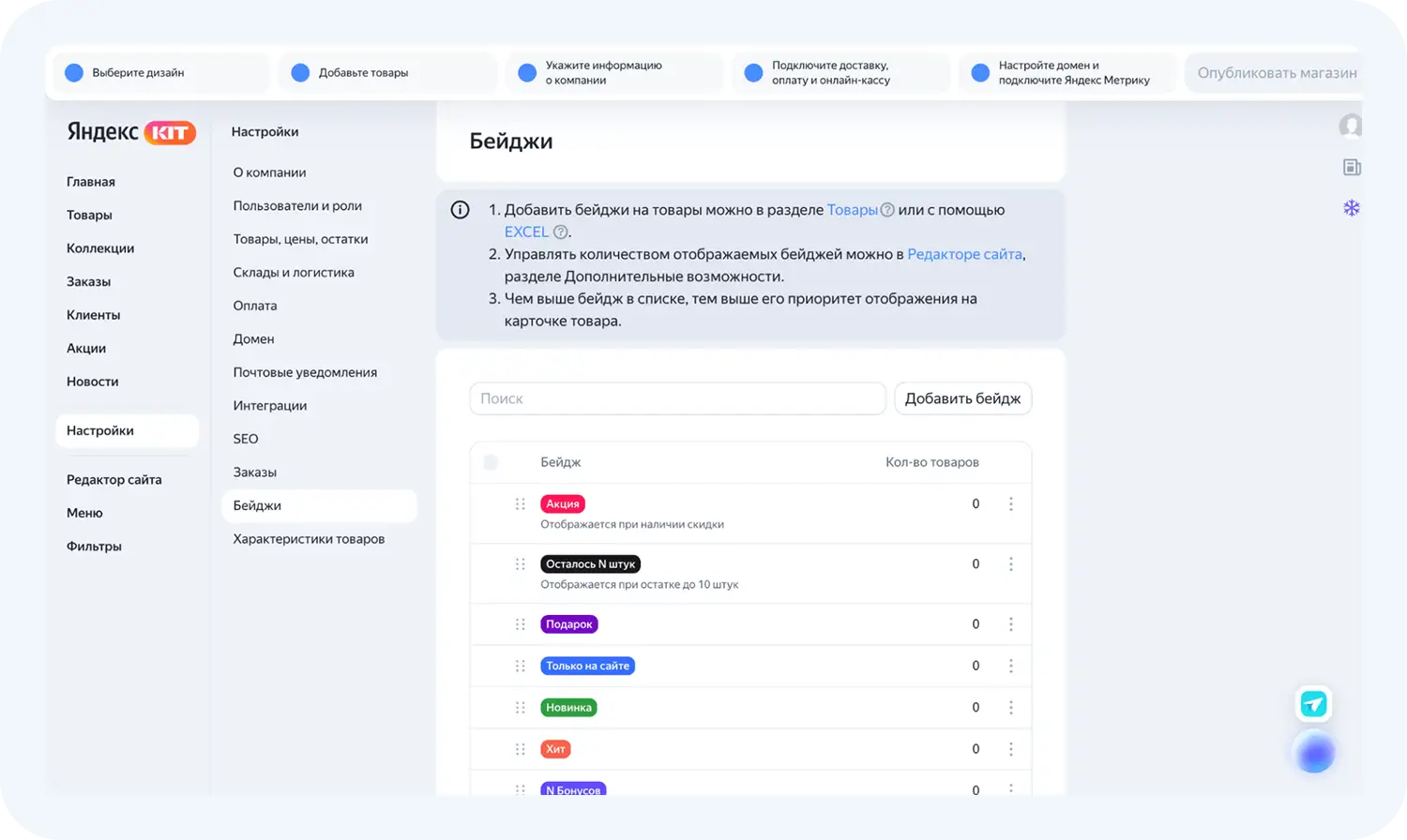 Внутри сервиса есть разделы, которые необходимо заполнить перед публикацией магазина. Проведем обзор Яндекс КИТ.