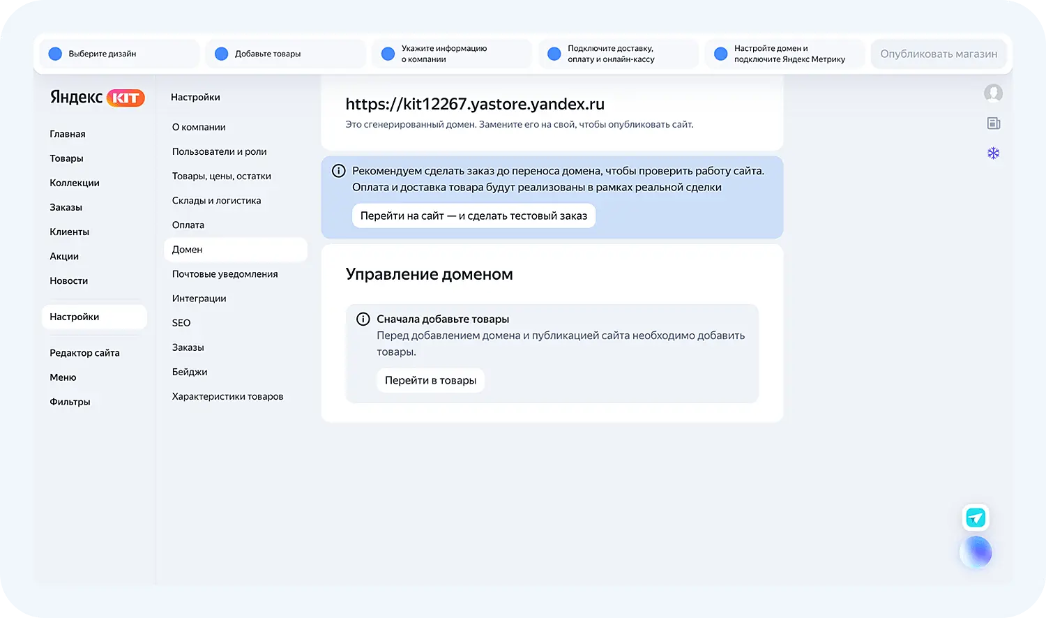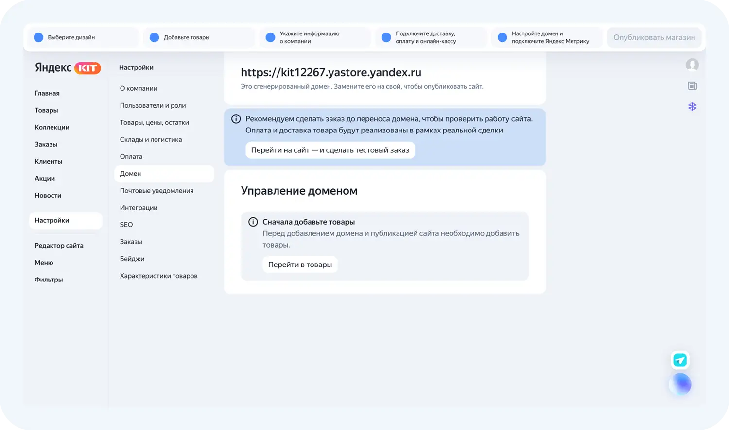 Блок Домен позволяет выбрать персональный домен для вашего сайта. Сделать это можно только после добавления товаров: